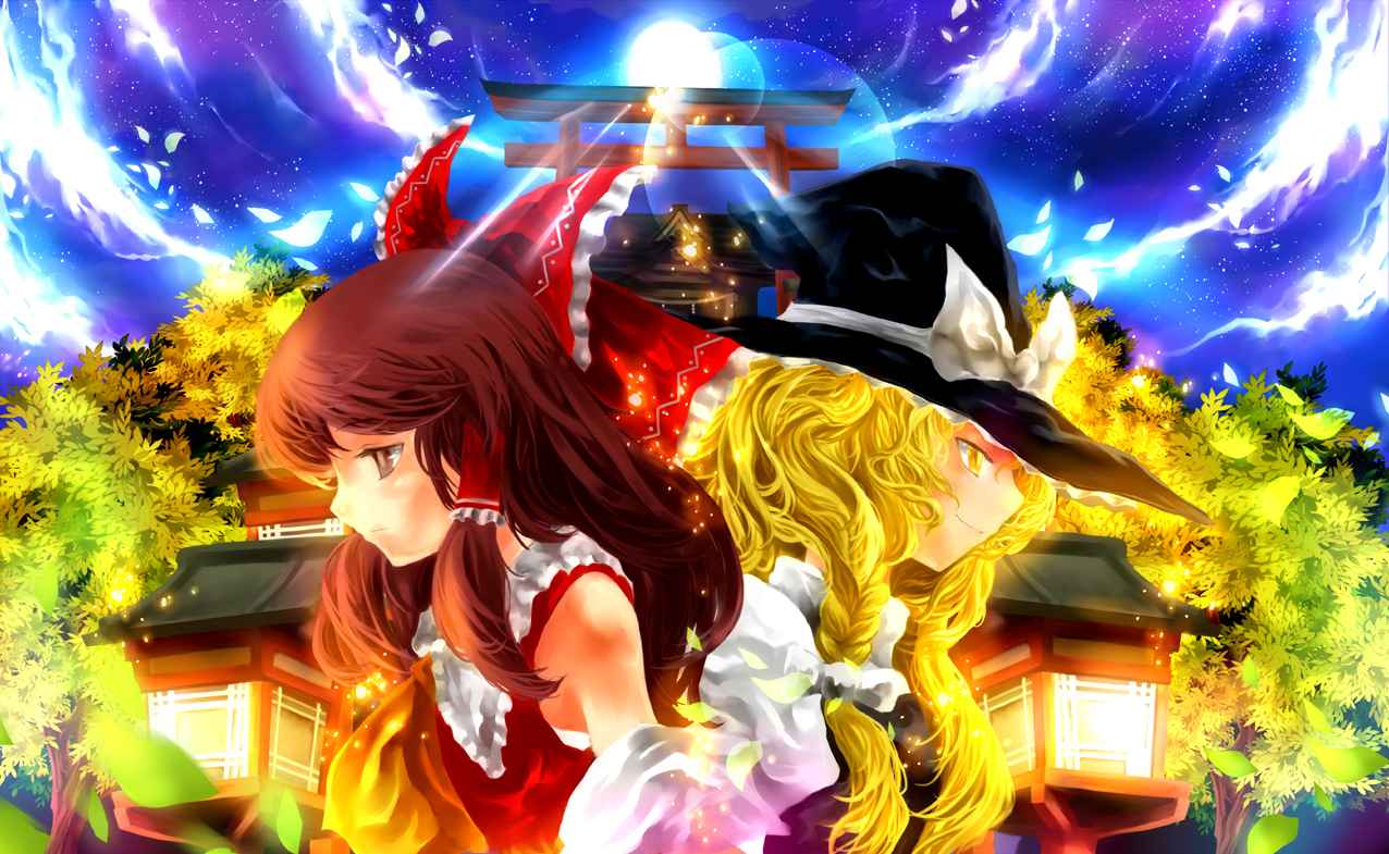 2girlsblonde hairbrown hairdetached sleevesfemale focushair ribbonhatjapanese clothesmikomoonmultiple girlspetalsribbonshrinetoriiwitchwitch hatyellow eyes