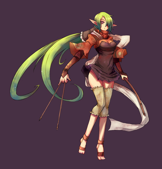 arrow (projectile)bow (weapon)elffantasygradient hairgreen hairhair over one eyelong hairmulticolored hairpointy earssolovery long hairweapon