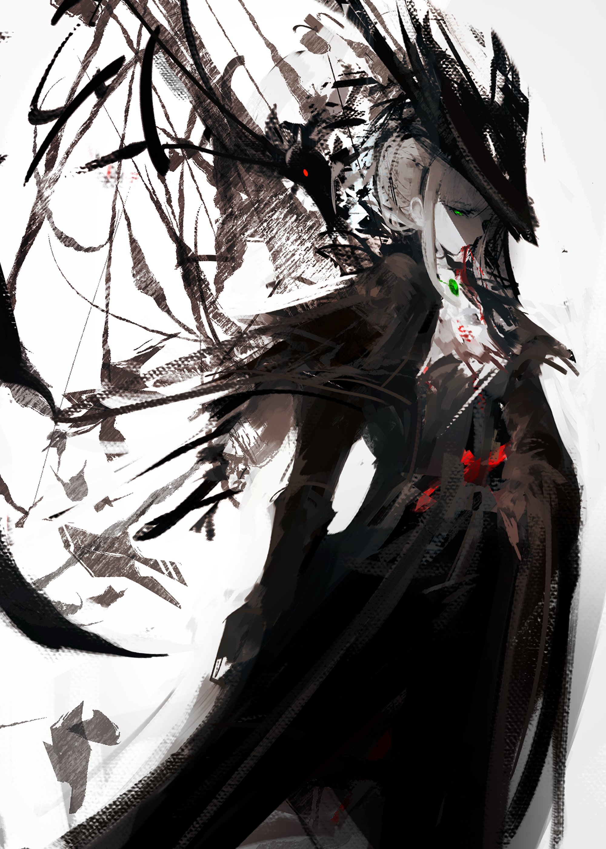 1girlascotbloodcapecoatgemglovesgreen eyeshathat featherlong hairlooking at viewerponytailsimple backgroundsolotricornewhite hair