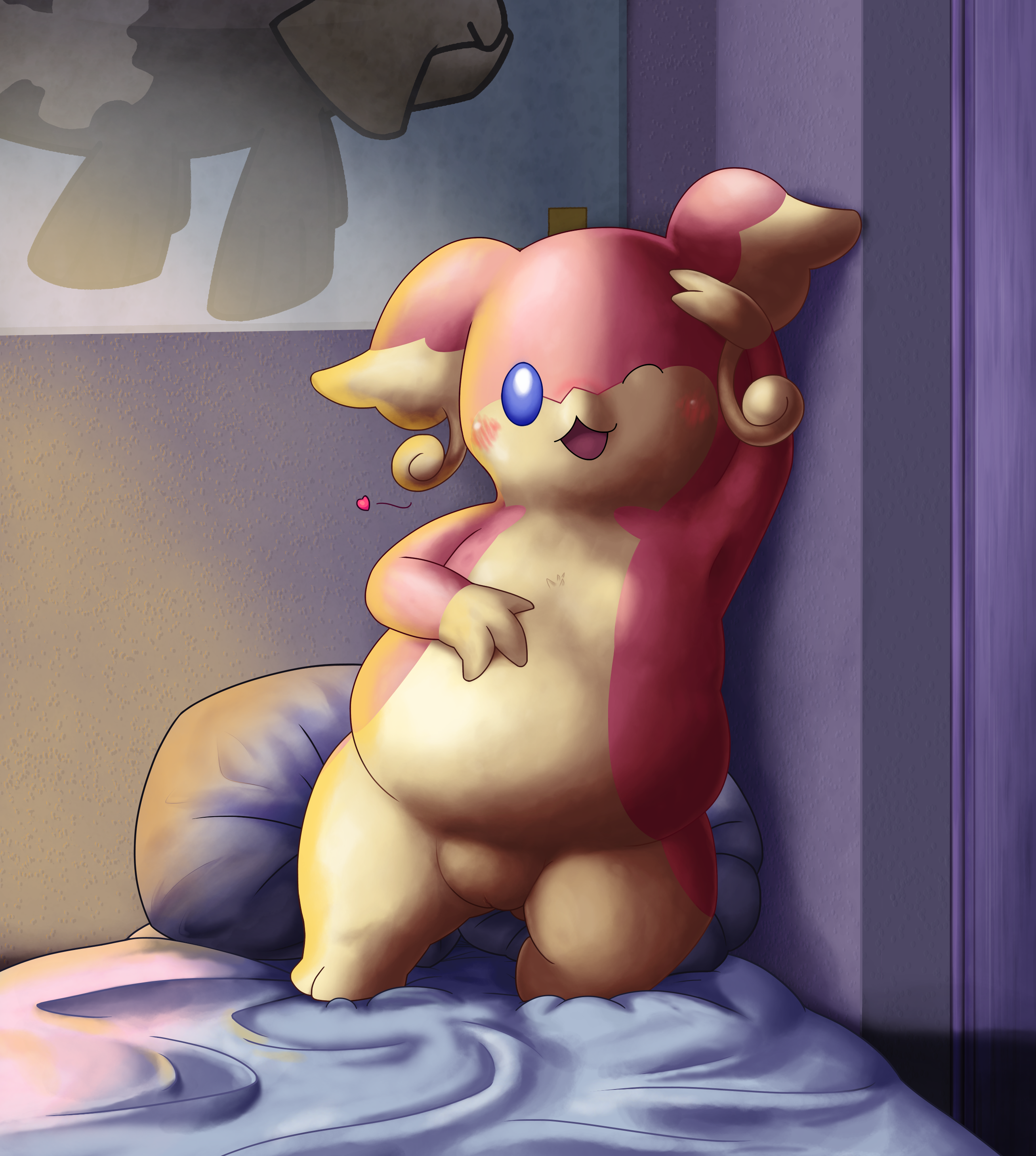 against wallbedbed sheetblushchubbyfemaleFlag for Deletioninsidelooking at viewerone eye closedopen mouthpokemonpussysolostandingvideo games