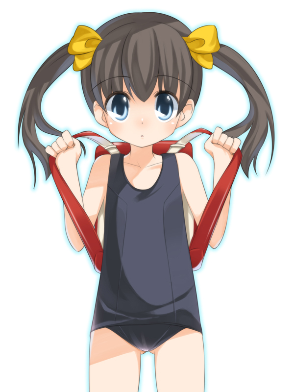 1girlbackpackbagblack one-piece swimsuitblue eyesblushbowbrown haircollarboneflat chesthair ribbonlolilong hairlooking at viewerone-piece swimsuitopen mouthrandoseruribbonschool swimsuitstandingswimsuittwintailswhite backgroundyellow ribbon