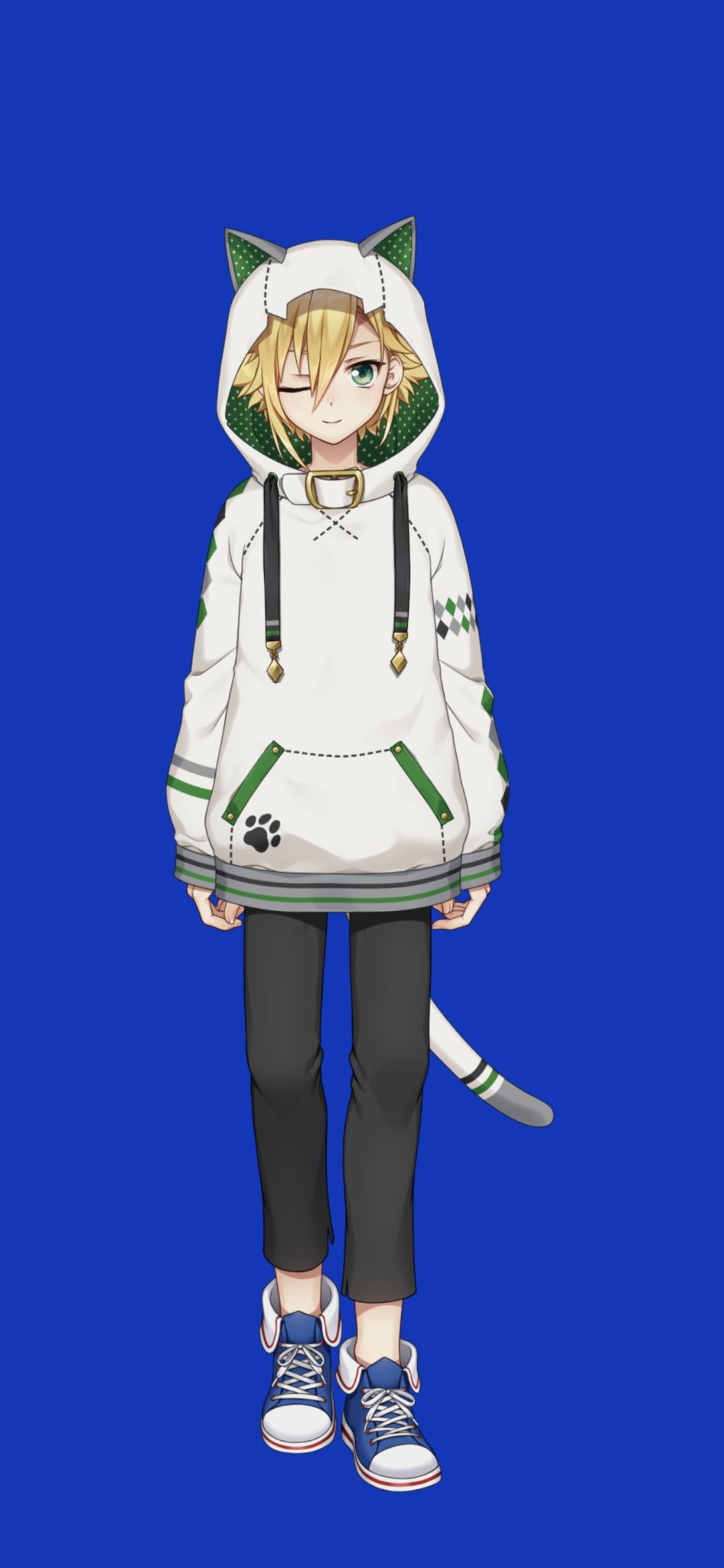 1boyanimal earsanimal hoodarms at sidesblonde hairblue backgroundblue shoescat earscat hoodcat tailclosed mouthdrawstringfake animal earsfake tailflipped hairfull bodygreen eyesgreen hoodiegrey pantshair between eyeshoodhood uphoodielong sleeveslooking at viewermale focusno socksone eye closedpantspolka dotpolka dot hoodieshoesshort hairsidelockssimple backgroundsmilesneakerssolostandingtailtwo-sided fabricvirtual youtuberwhite hoodie