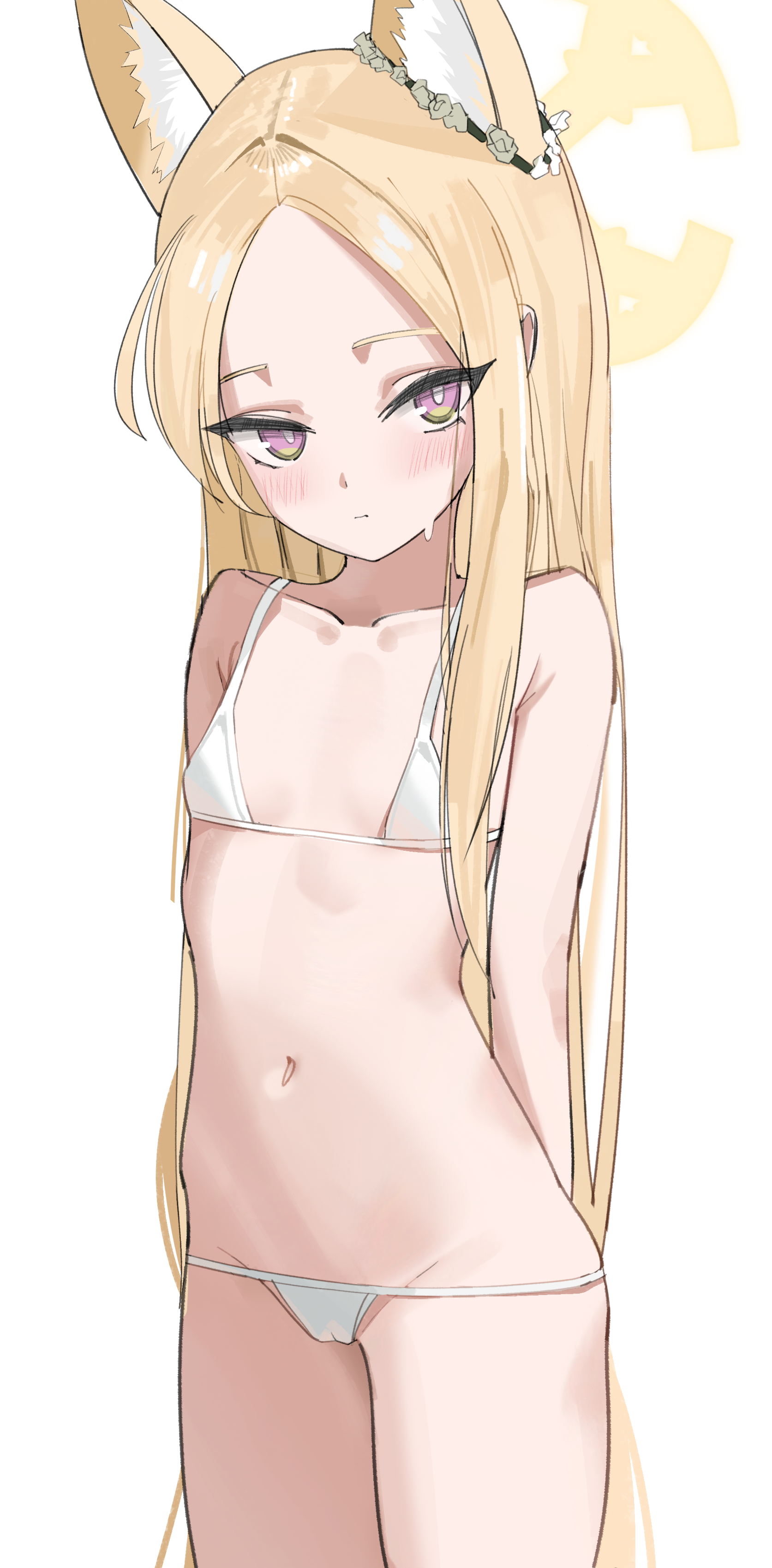 1girlanimal ear fluffanimal earsbikiniblonde hairblushbrabreastsclosed mouthcollarbonecowboy shotflowerforeheadfox earsfox girlgroinhair flowerhair ornamenthalolong hairlowleglowleg pantiesmicro bikininavelpantiespurple eyessimple backgroundsmall breastssolostandingswimsuitunderwearvery long hairwhite backgroundwhite bikiniwhite brawhite pantiesyellow halo