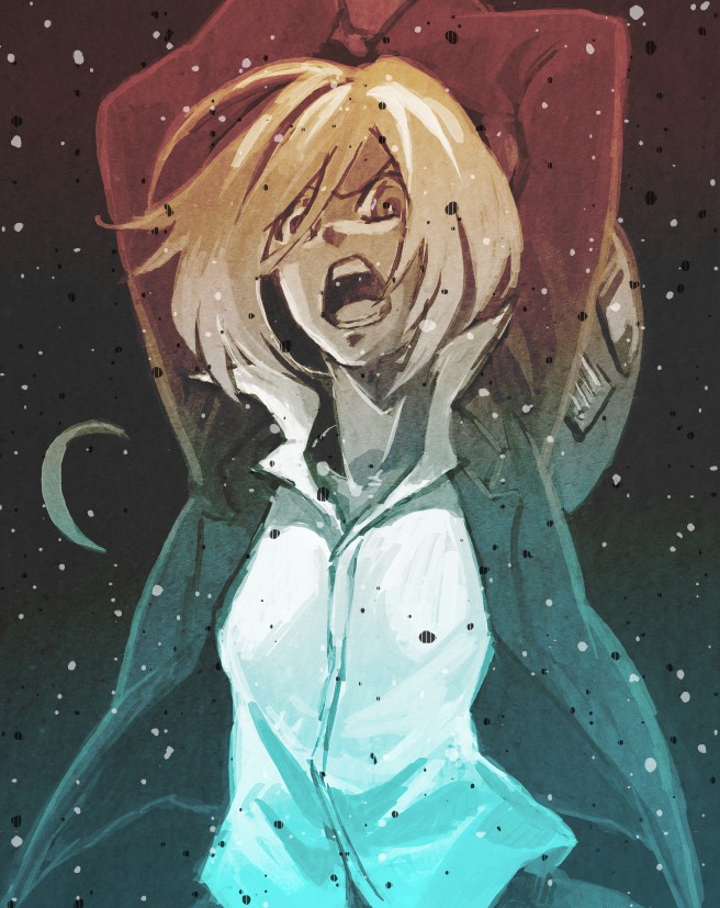 1girlangryarms upattackblazerdress shirtfemale focusguitarhair over one eyeholdinginstrumentjacketopen mouthshirtshort hairsolo
