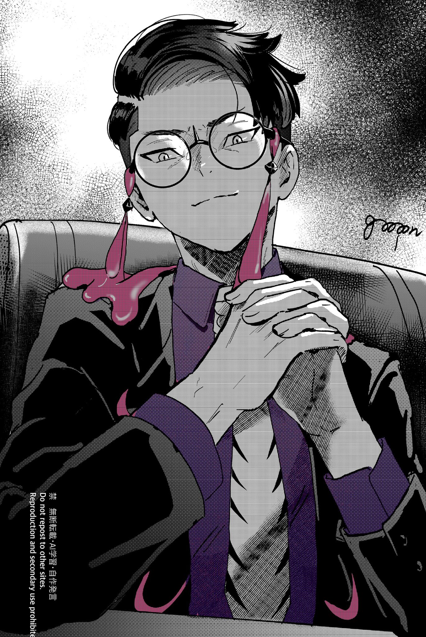black jacketchairclosed mouthcollared shirtfingernailsglassesjacketlapelslong sleeveslooking at viewernecktieopen clothesopen jacketown hands claspedown hands togetherparted hairpurple shirtround eyewearshirtshort hairsignaturesittingsuit jackettasselwatermarkwhite necktiewing collaryellow eyes