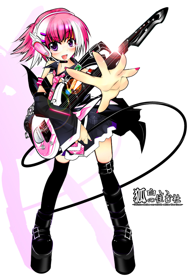 1girlbass guitarblack thighhighsbootscopyright namedetached sleeveselectric guitarfemale focusglassesguitarheadphonesinstrumentlens flarelooking at viewermulticolored hairnail polishnecktieoutstretched armpink hairplatform bootspurple eyesred nailsshort hairskirtsolostreaked hairthighhighszettai ryouiki