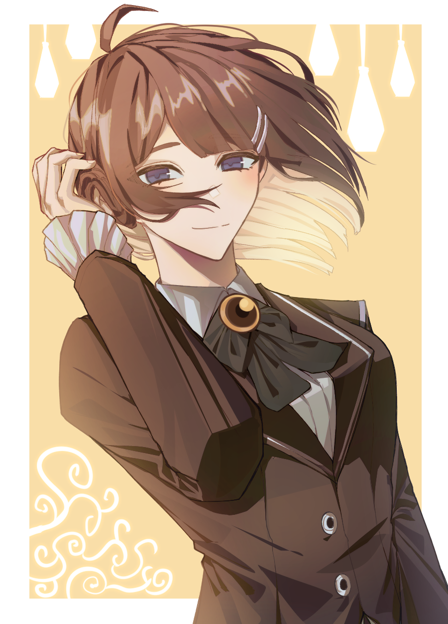 1girlahogeborderbowbowtiebroochbrown hairbrown jacketclosed mouthcollared shirtfrilled sleevesfrillsgreen bowgreen bowtiehair ornamenthaircliphand upjacketjewelrylapelslooking at viewermedium hairshirtsmilesolowhite borderwhite shirt