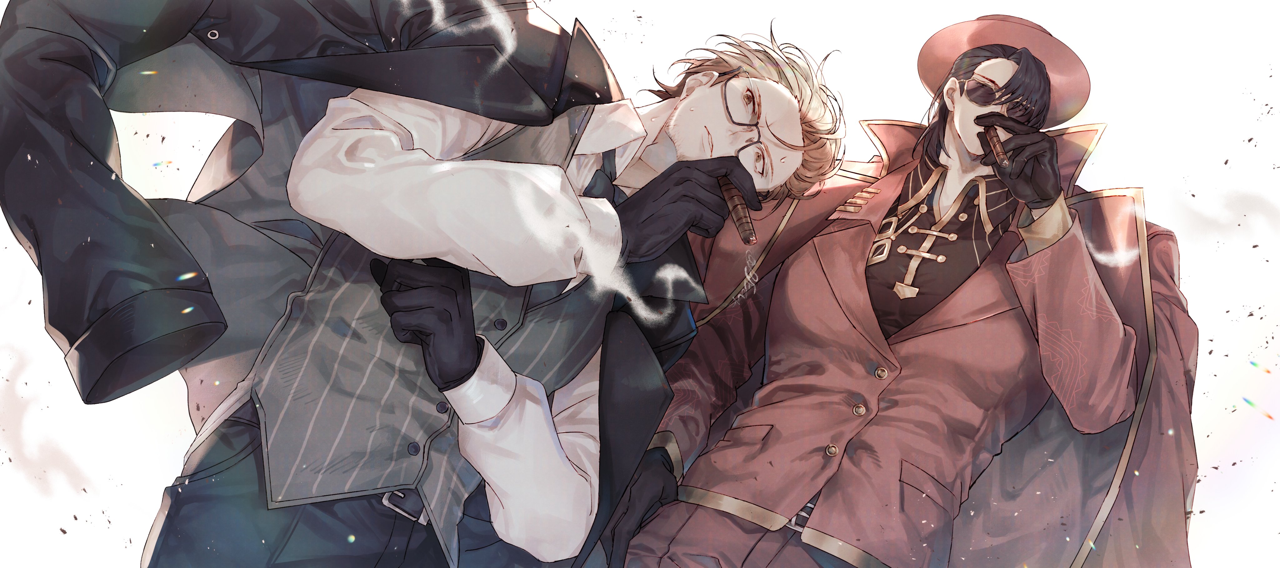 2boysadjusting sleevesbeard stubblebeltblack glovesblack hairblack jacketblack necktieblack shirtbrown haircigarcoatcollared shirtcurtained hairfacial hairfacing viewerfedorafrom belowglassesglovesgold trimhair slicked backhand uphatholdingholding cigarjacketjacket on shoulderslens flarelight particleslong sleevesmale focusmultiple boysnarrowed eyesnecktienight awls (identity) (project moon)official alternate costumeparted lipsred coatred jacketred vestseriousshirtsmokingstriped clothesstriped veststubblesunglassesthumb (identity) (project moon)vestwhite shirtwind