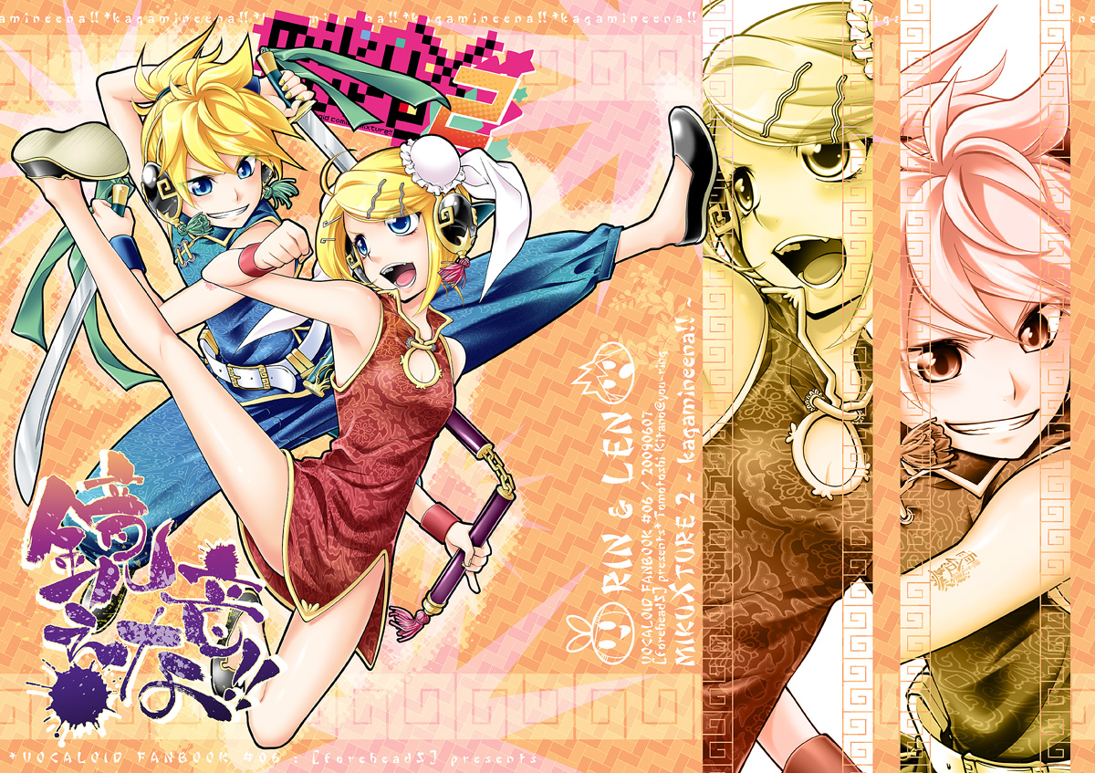 1boy1girlalternate hairstylebrother and sisterbun coverchina dresschinese clothesdao (weapon)dressflatshair bunjumpingkickingnunchakupinky outsiblingsside slitsingle hair bunswordthree section stafftwinsweaponzoom layer