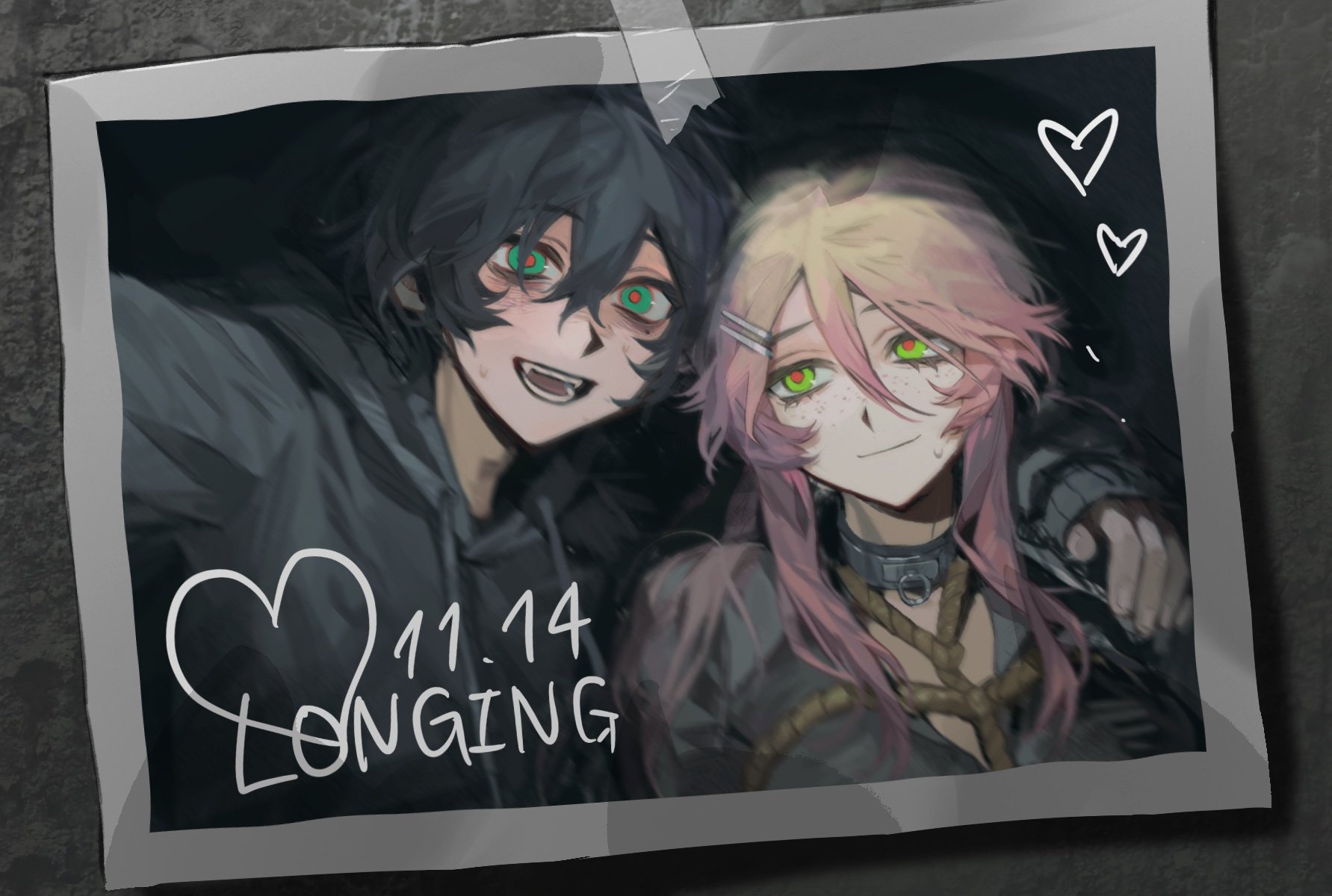 1boy1girlbdsmblack hairbondageboundcollargreen eyeshair between eyesphoto (object)pink hairropesleeves past wrists