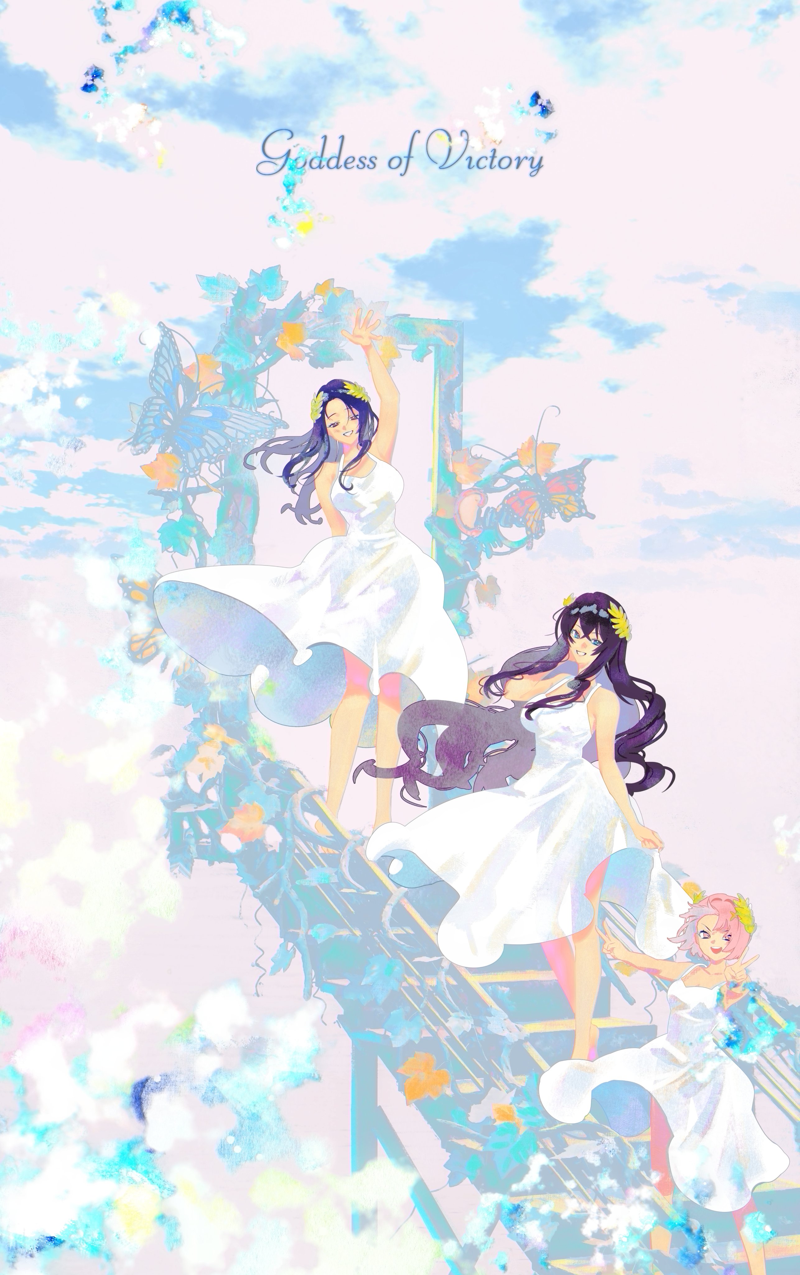 3girlsblack hairblue eyesblue skyblushbreastsclouddresshair between eyeshair ornamentinherit (nikke)long hairlooking at viewermonarch butterflymultiple girlsopen mouthpink eyespink hairpurple hairred eyesshort hairskysmilestairsvvery long hairwavingwhite dress