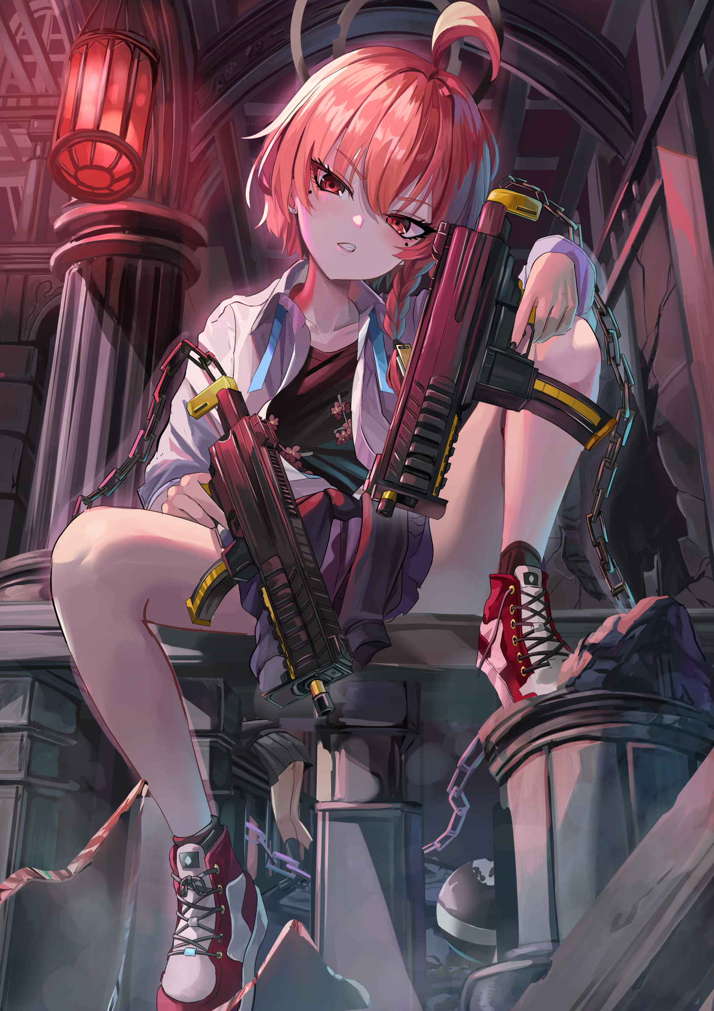 1girlahogebacklightingblack haloblack skirtbraidchainclenched teethclothes around waistcollared shirtcross-laced shoesdress shirtdual wieldingeyelasheseyes visible through hairfloral printfloral print shirtfull bodygunhair between eyeshalohand upholdingholding gunholding weaponindoorsknee uplamplight blushlooking at viewerminiskirtmolemole under each eyemole under eyemultiple molesofficial alternate costumeopen clothesopen shirtorange hairpleated skirtprint shirtred eyesred shoesrubbleschool uniformshirtshoesshort hairsig mpxsingle braidskirtsneakerssolospread legssubmachine gunteethtsurimev-shaped eyebrowsweaponwhite shirt
