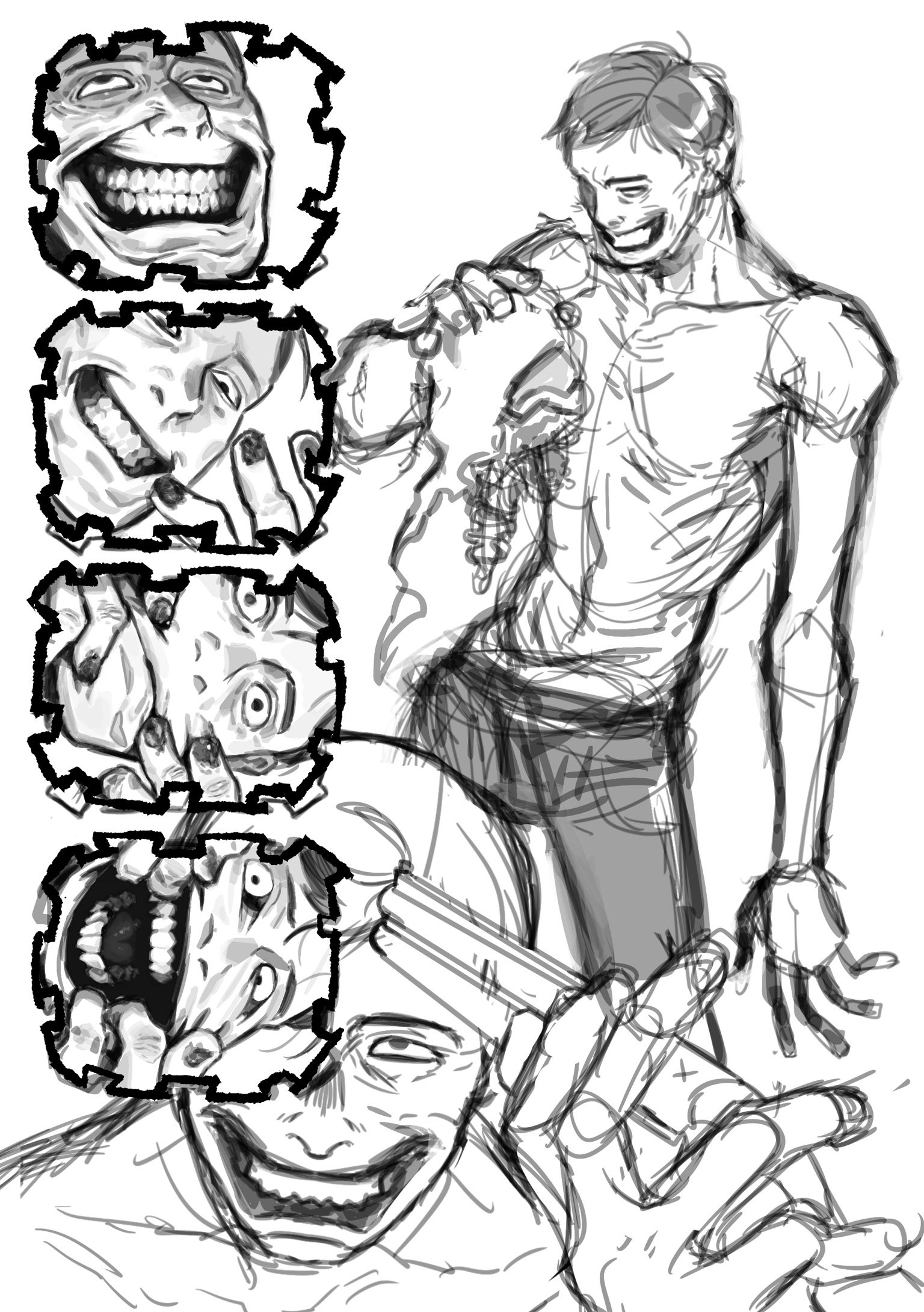1boyblack eyesblack haircrazy eyesgunholdingholding detached headholding gunholding weaponlooking at viewermale focusmissing fingernailsmonochromeopen mouthshort hairsketchteethtopless maleweapon