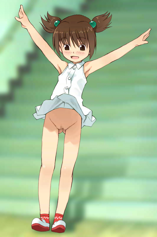 1girlblushbrown eyesbrown haircensoredclothes liftdresshair bobbleshair ornamentjumpinglegslolilooking downno pantiesopen mouthpussyred socksshoesshort hairshort twintailsskirtskirt liftsleevelesssleeveless dresssmilesocksstairstwintailsuwabakiwhite dresswindwind lift