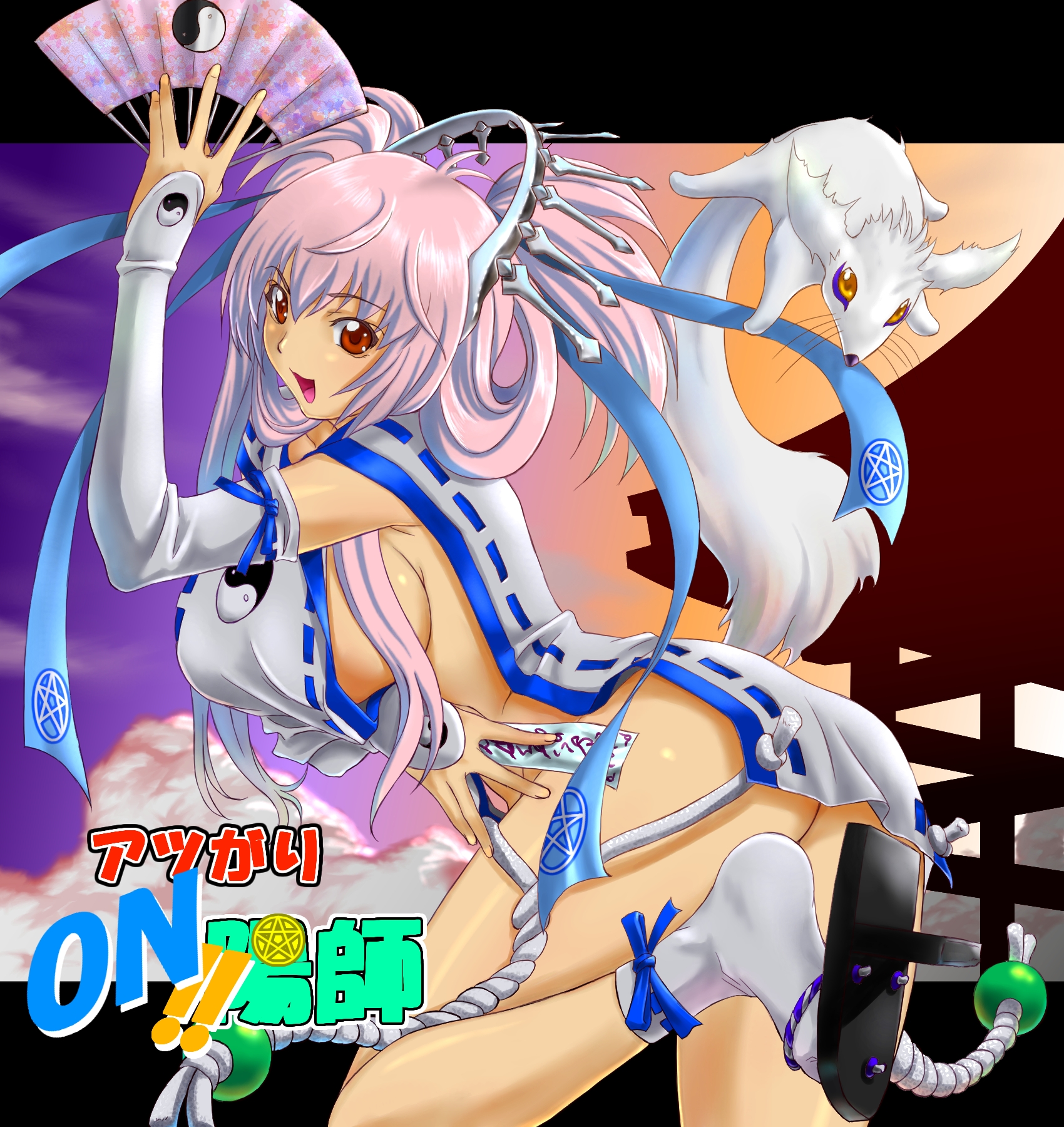 1girlbreastsfemale focusgetahand fanhuge breastslong hairnaked tabardonmyoujiopen mouthpentagrampink hairpurple hairred eyessideboobsolotabardtengu-getayin yang