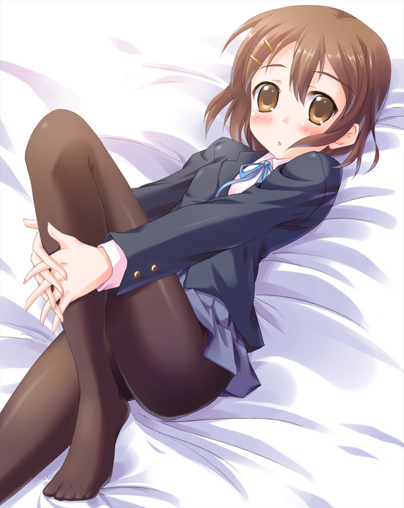 00s1girlbed sheetblazerblushbrown eyesbrown hairfeetfemale focushair ornamenthairclipjacketpantyhosesakuragaoka high school uniformschool uniformshort hairsolo