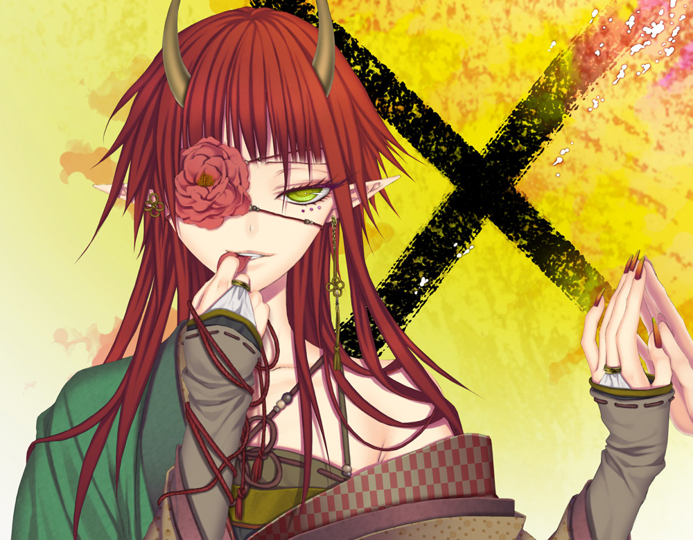 1girleyepatchfemale focusfingernailsgreen eyeshornslickinglong fingernailslong hairnail (hardware)nail polishorange nailspointy earsred hairsolotongue