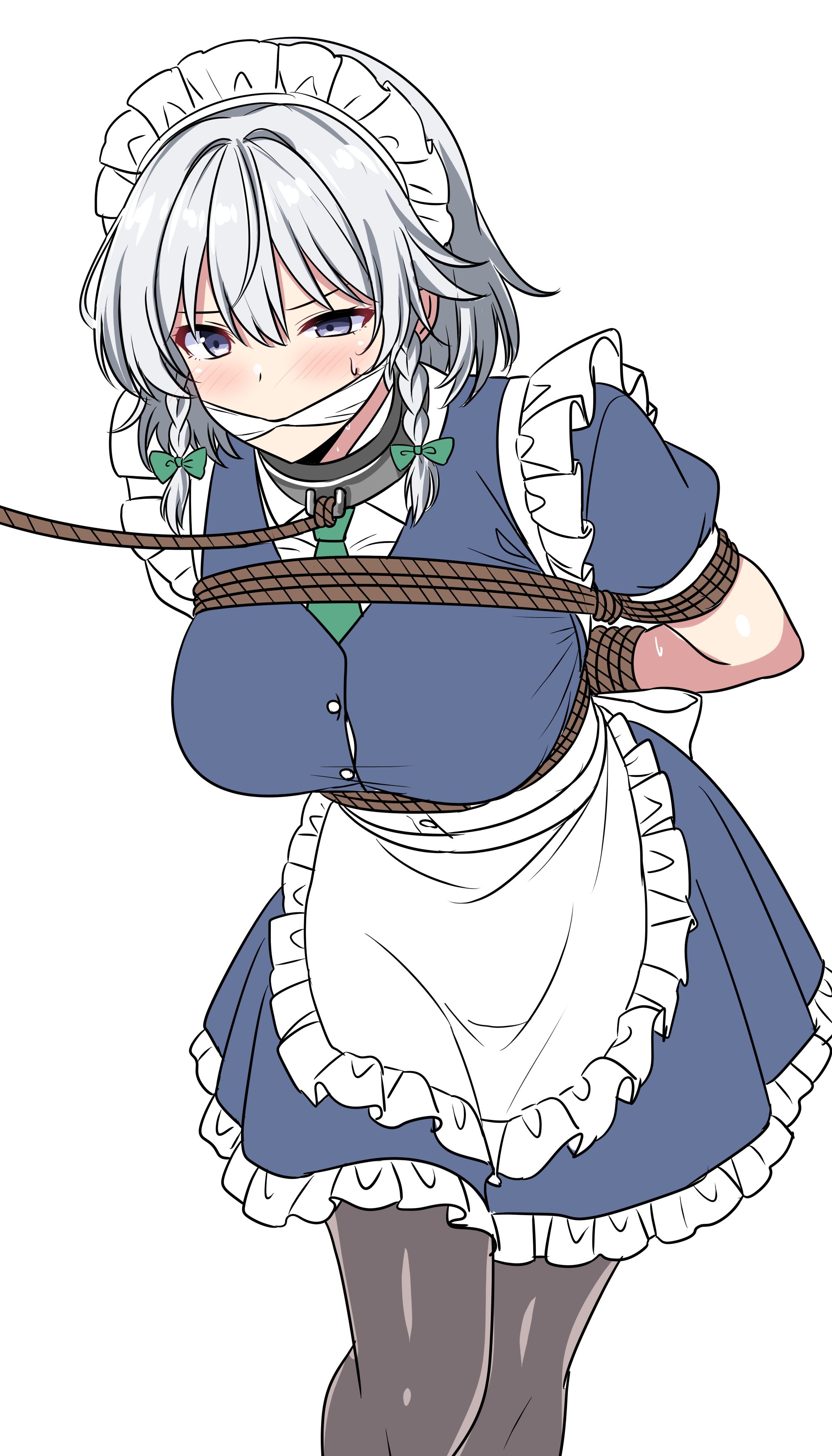 1girlapronarms behind backbdsmblue skirtblue vestblushbondageboundbound armsbowbraidbreastsbrown pantyhosecloth gagcollarcollared shirtfrilled skirtfrillsgaggaggedgreen bowgreen necktiegrey hairhair bowimprovised gaglarge breastsleashlong hairmaidmaid headdressnecktiepantyhosepuffy short sleevespuffy sleevesropeshirtshort sleevessimple backgroundskirtsolosweattwin braidsvestwaist apronwhite apronwhite backgroundwhite shirt