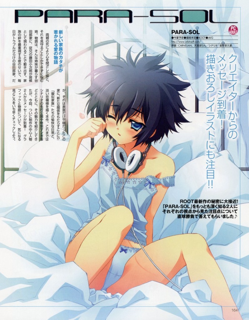 1girlbedblack hairblue eyesblushfemale focusflat chestheadphoneslingerieone eye closedpantiespetalsshort hairsolounderwearwink