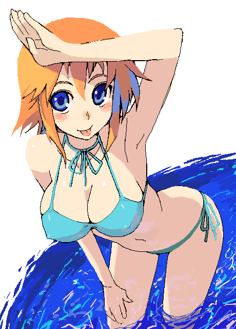 :p1girlaqua bikiniarmpitsbikiniblue eyesblushbreastscleavagefemale focuslarge breastsoekakiorange hairshort hairside-tie bikini bottomsoloswimsuittonguetongue outwadingwhite background