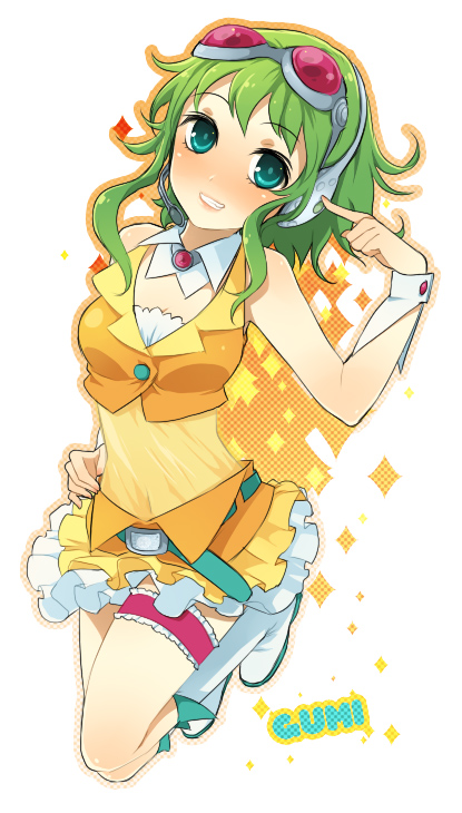 1girlblushbootsfemale focusgogglesgreen eyesgreen hairgrinheadsetmatching hair/eyessee-through clothesskirtsmilesolo