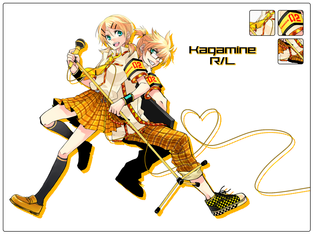 1boy1girlalternate hairstylearmbandback-to-backblonde hairbrother and sistercasualheartheart of stringinstrumentkneehighsmicrophonemicrophone standnecktiepantsplaid clothesplaid pantsplaid skirtsiblingsskirtsockstwinstwintailsyellow necktie