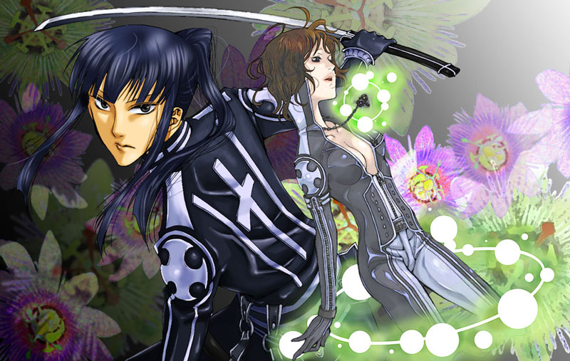 00s1boy1girlblack hairblue hairbodysuitbreastsbrown haircleavagejewelrylong hairnecklaceno braponytailshort hairswordweapon