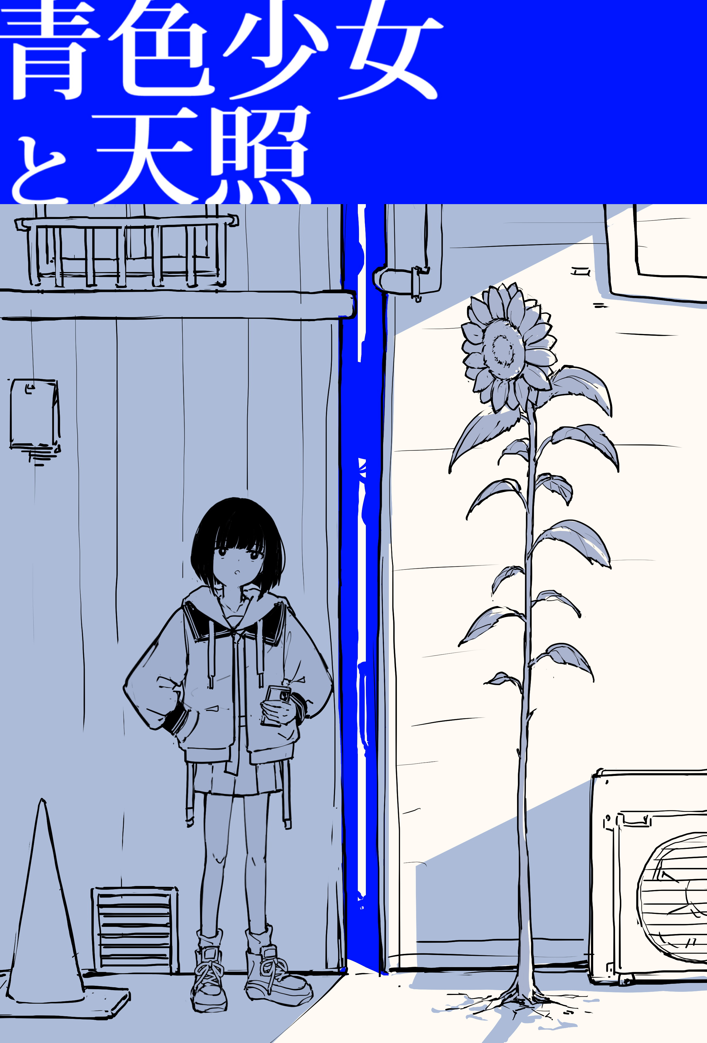 :o1girlair conditionerblue themecellphonedrawstringflowerhand in pocketholdingholding phonehoodhood downhoodiejacketlong sleeveslooking at viewermonochromeopen clothesopen jacketparted lipsphonepleated skirtpuffy long sleevespuffy sleevesshoesshort hairskirtsockssolostandingsunflowertraffic cone