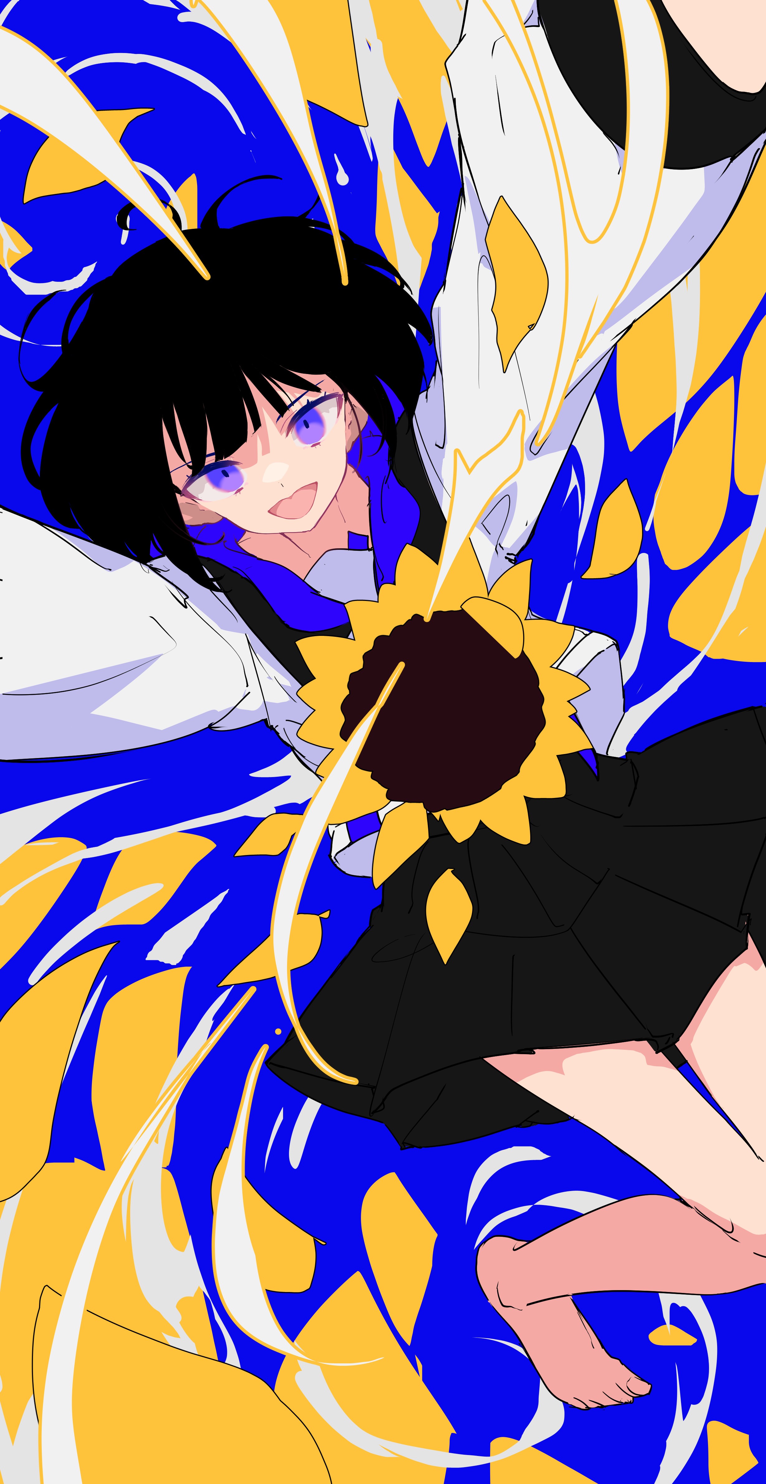 :d1girlbarefootblack hairblack skirtblue backgroundbob cutflowerhoodhood downknees together feet apartlong sleeveslooking at viewermulticolored hairopen mouthpetalspleated skirtpuffy long sleevespuffy sleevespurple eyespurple hairshort hairsimple backgroundskirtsmilesolosunflowertwo-tone hairyellow flower