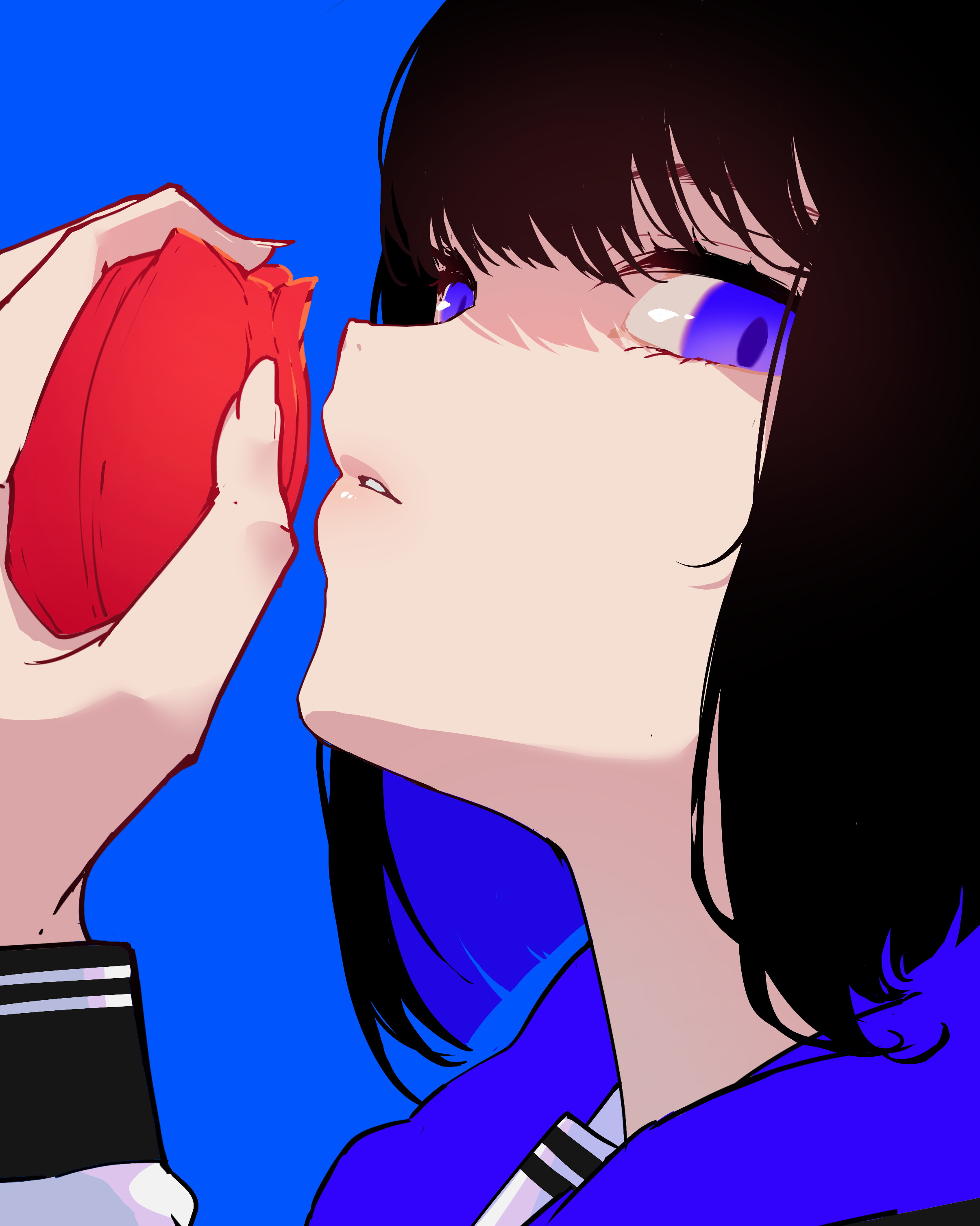 1girlblack hairblue backgroundblue hairbob cutfingernailsfrom sidehand upholdinghoodhood downlong sleeveslooking at viewerlooking to the sidemulticolored hairparted lipspuffy long sleevespuffy sleevespurple eyesshirtshort hairsimple backgroundsolotwo-tone hairwhite shirt