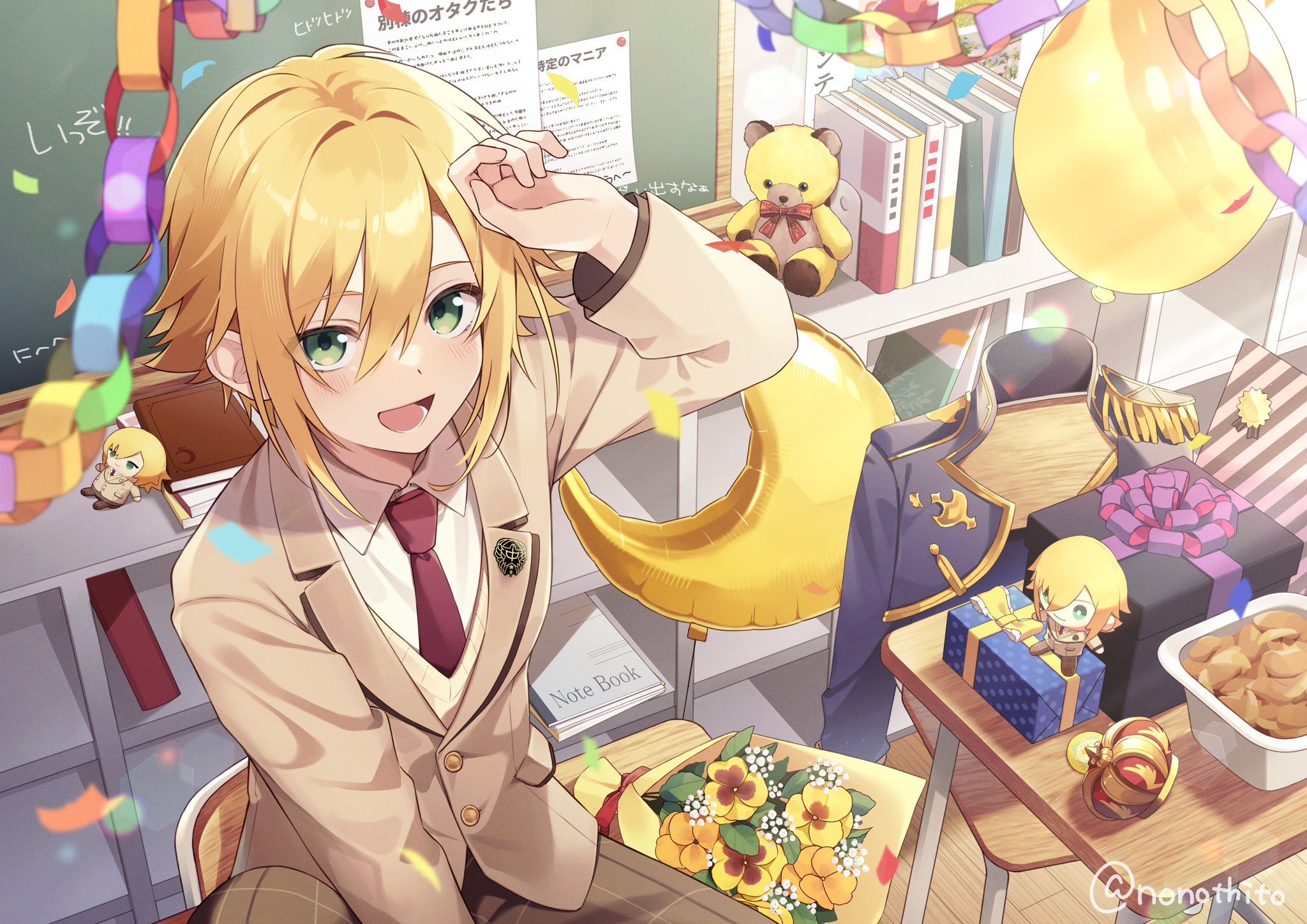seraziel, tohru (maidragon), kobayashi-san chi no maidragon, highres, 1girl, blonde hair, breasts, completely nude, dragon girl, dragon horns, dragon tail, hair between eyes, hand on own chest, horns, large breasts, long hair, multiple views, navel, nipples, nude, open mouth, pussy, pussy juice, pussy juice puddle, red eyes, sitting, smile, tail, uncensored
