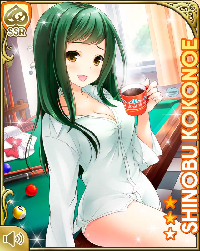 1girlballbilliard ballbilliardsbreastsbrown eyescard (medium)character namecleavagecue stickcupcurtainsgreen hairholdingholding cuplarge breastslong hairlooking at viewermugopen mouthpool tableraised inner eyebrowsshirtshirttailsmilesolostandingtablethighsunworn clotheswhite shirtwindow