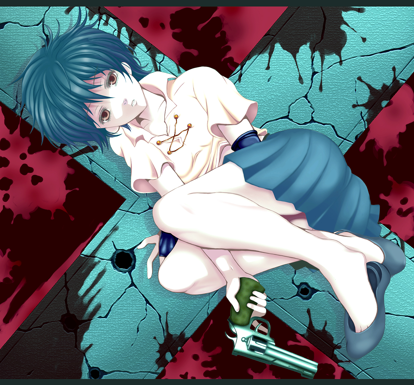 1girlblack hairbloodblue hairbrown eyesfemale focusflatsgunhandgunlyingrevolvershoe dangleshort hairskirtsolotrigger disciplineweapon