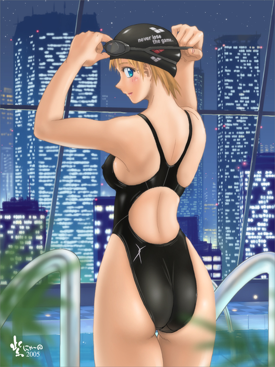 1girlassblonde hairblue eyescityscapecompetition swimsuitenglish textfemale focusfrom behindgogglesindoorslooking backnightone-piece swimsuitpoolpool ladderpoolsideprofilesolostandingswim capswimsuitwindow