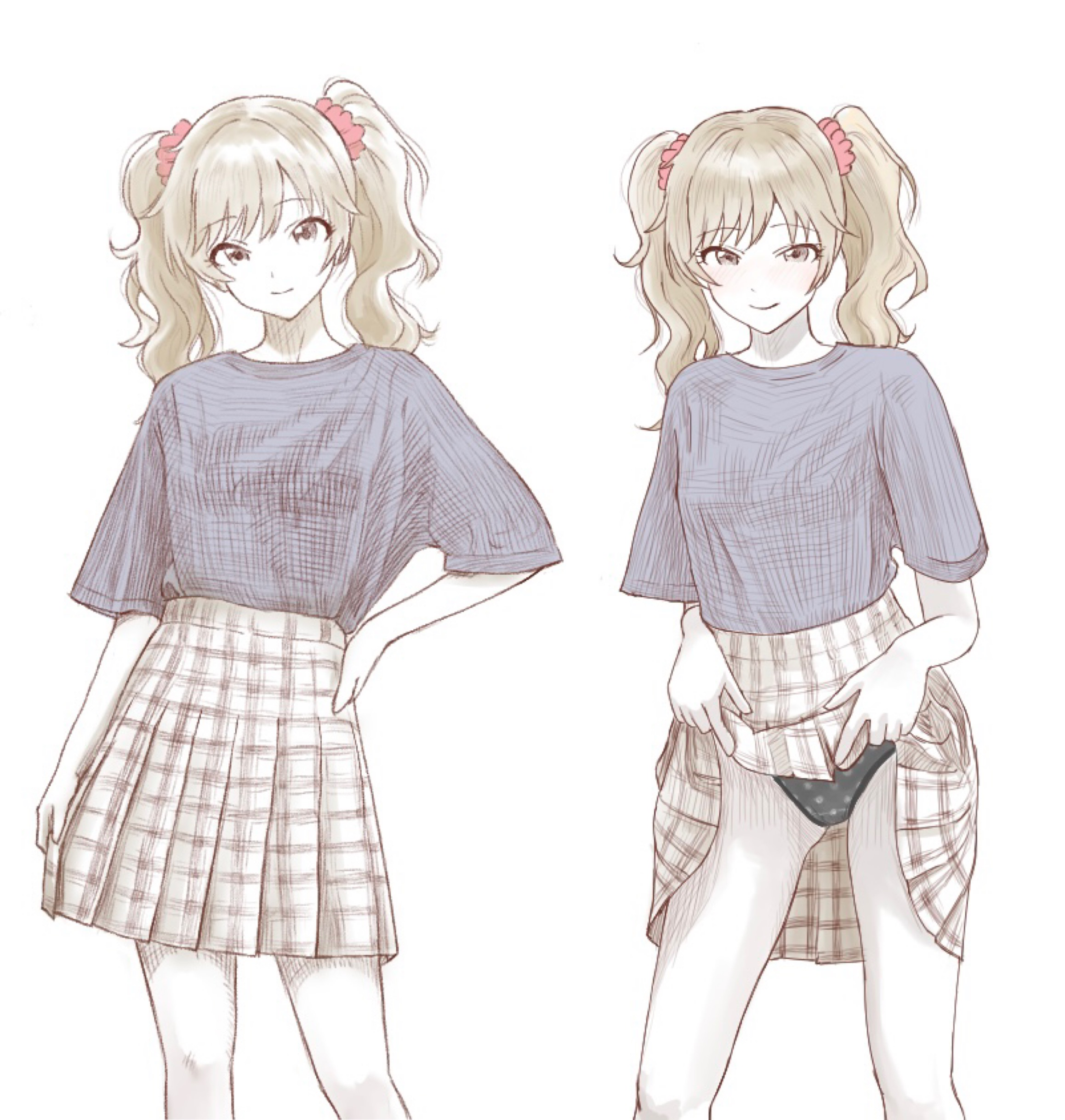 1girlblack pantiesblonde hairblue shirtclothes liftcontrappostogrey eyeshair ornamenthair scrunchiehand on own hiphead tiltlifting own clotheslooking at viewermultiple viewspantiespleated skirtpolka dotpolka dot pantiesred scrunchiescrunchieshirtshirt tucked insimple backgroundskirtskirt liftsmilestandingt-shirttwintailsunderwearwhite background