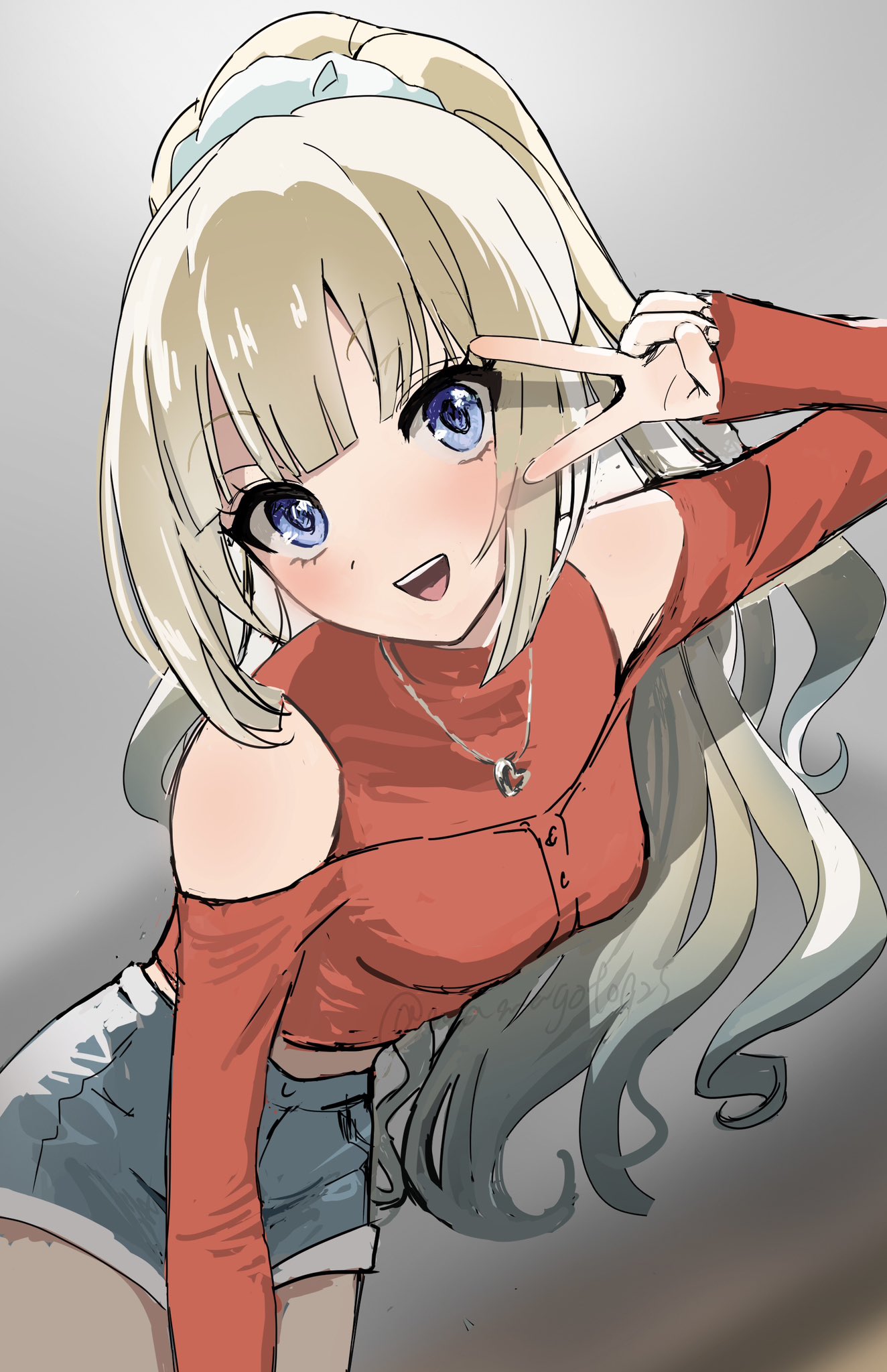 1girlarm upblonde hairblue eyesblunt bangsblushbreastsdenimdenim shortsgradient backgroundhair ornamenthair scrunchiejewelryleaning forwardlong hairlong sleeveslooking at viewermamagoto925midriffmulticolored hairopen mouthpendantponytailred shirtscrunchieshirtshortssidelockssimple backgroundsmall breastssoloteethupper bodyupper teeth onlyv