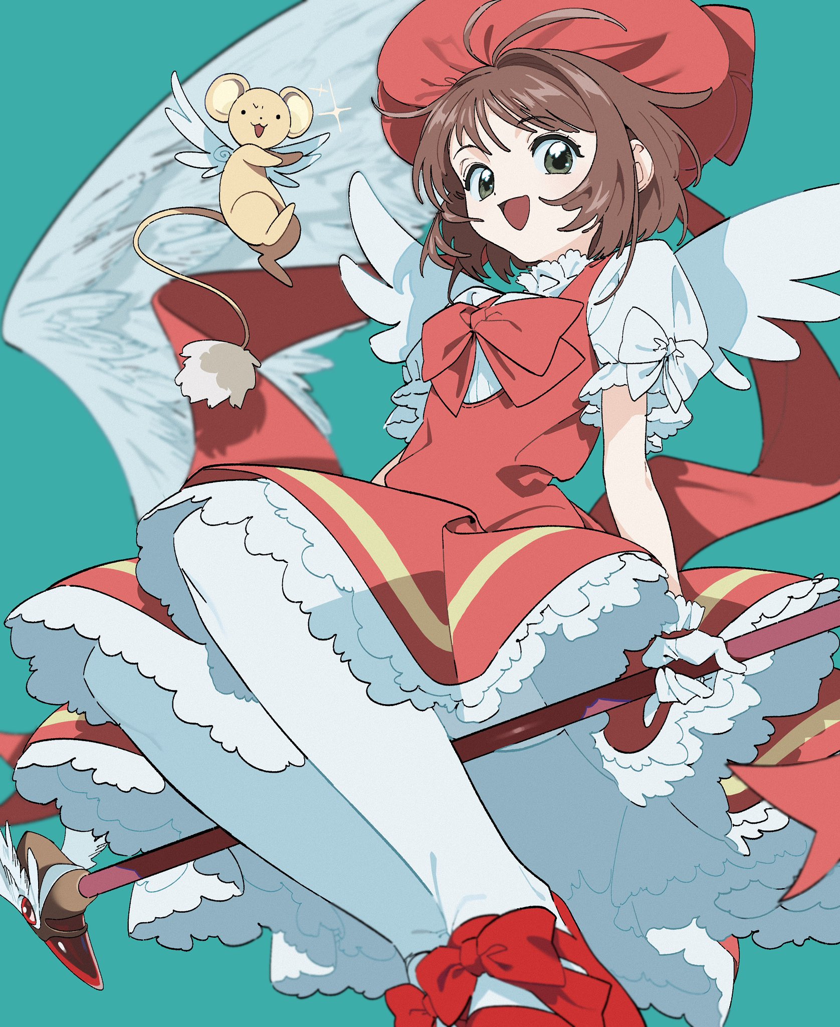 :d1girlbowbowtiebrown hairdressfrilled dressfrillsfuuin no tsuegreen backgroundgreen eyeshatholdingholding wandlooking at viewermob capopen mouthpuffy short sleevespuffy sleevesred bowred bowtiered dressshort hairshort sleevessmilethighhighswandwhite thighhighs