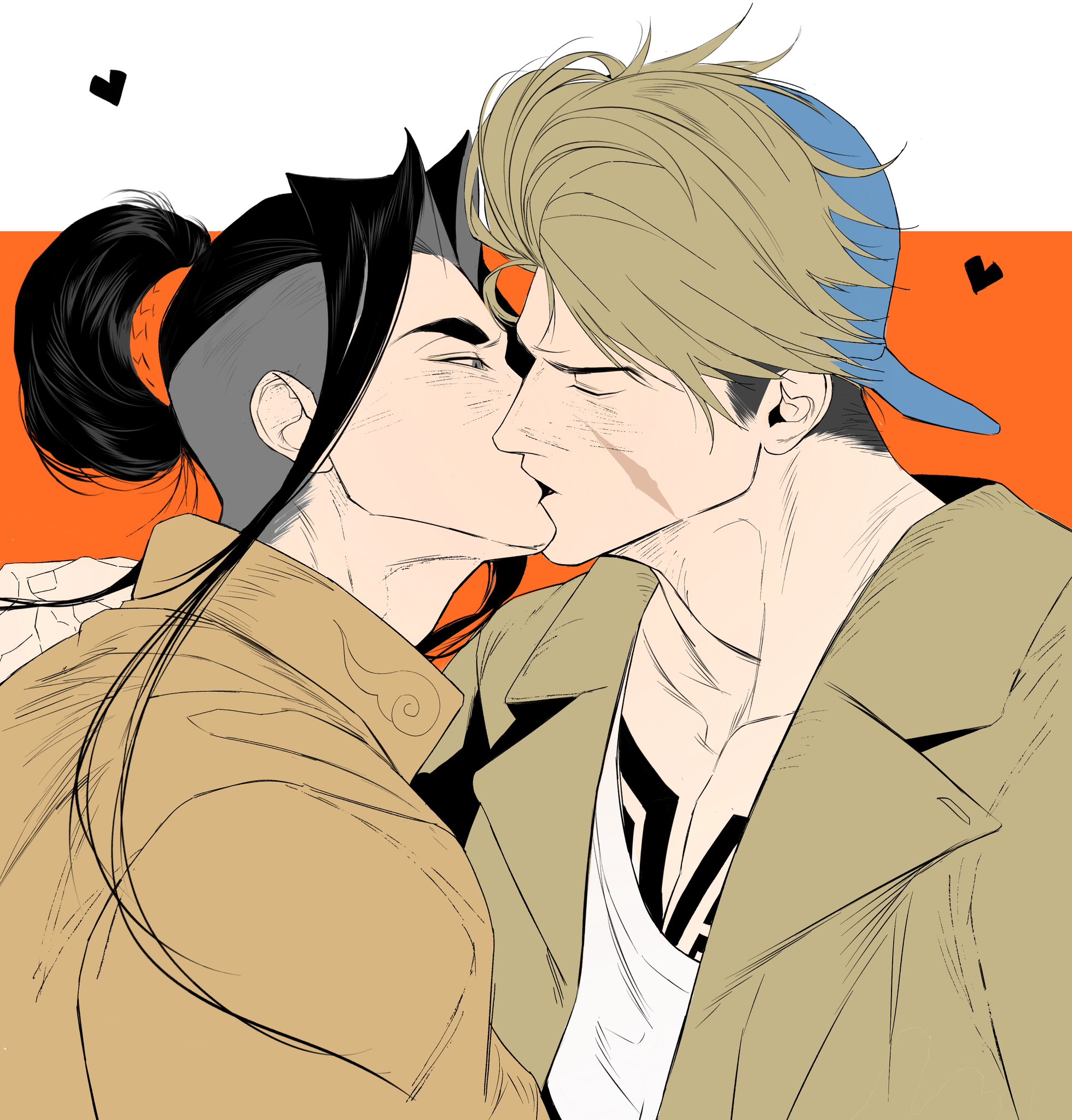 2boysbackwards hatbaseball capblack hairblue hatchest tattooclosed eyescollarbonecurtained hairfacial scarhatheartjacketkisslapelslooking at anothermale focusmultiple boysofficial alternate costumeopen clothesopen jacketponytailpopped collarscarscar on cheekscar on faceshirttattooundercutupper bodywhite shirtyaoiyellow jacket