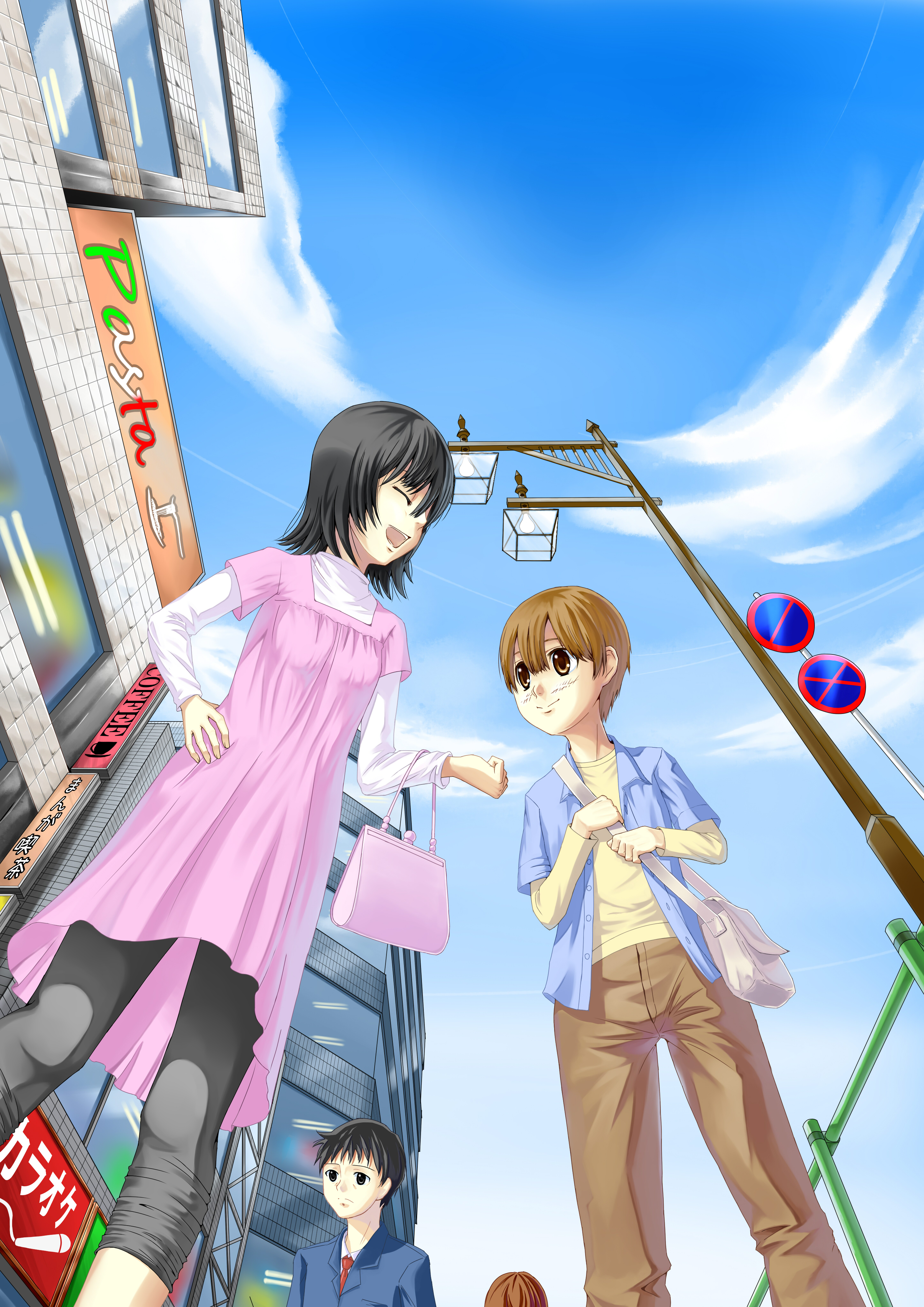 1girl2boysbagblack hairblushbrown eyesbrown hairchildclosed eyescoupledaydenimdressfrom belowhandbagheterojeansleggingsmultiple boyspantspink dressskysmile