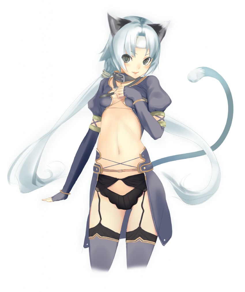 1girlanimal earsblack pantiescat earscat girlcat tailcollarcropped legsfemale focusflat chestgarter beltgrey eyesheadbandlong hairmidriffnavelopen clothespantiesponytailsimple backgroundsolotailthighhighsunderwearwhite backgroundwhite hair