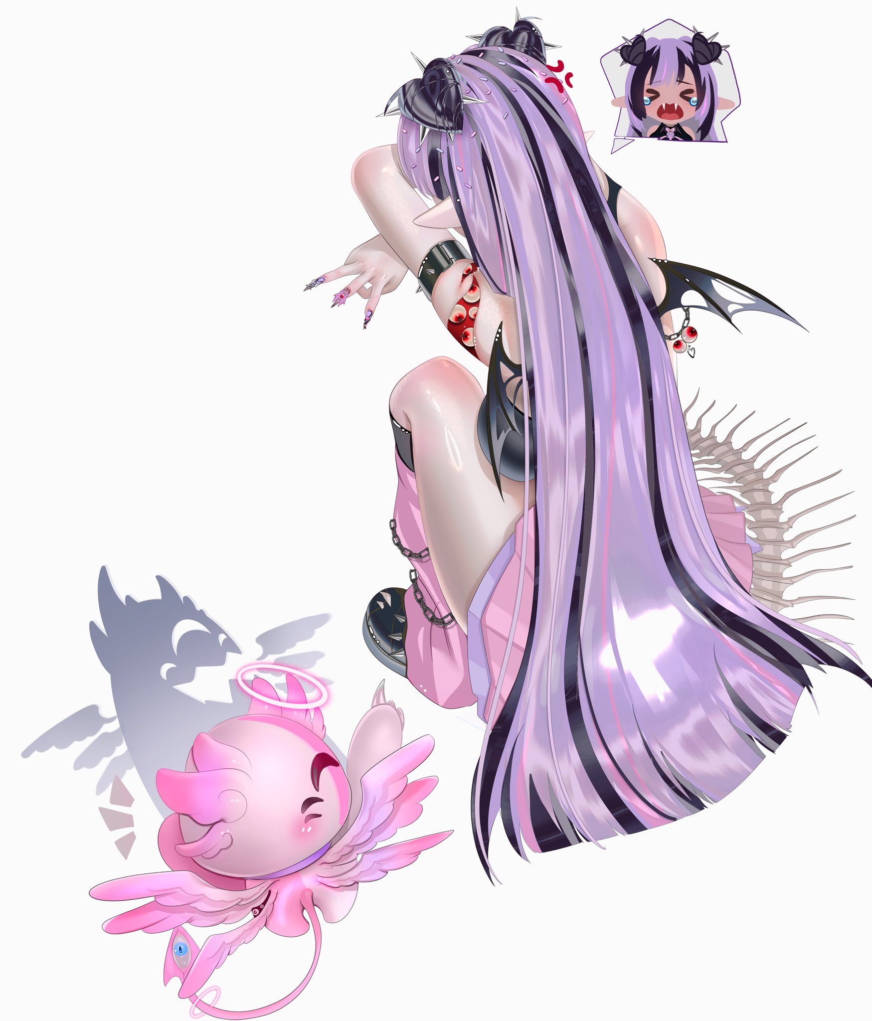 1girlanger veinbat wingsblack streaksbreastscat shadow puppet (meme)creaturedouble bunfacing awayfangsfingernailsfrom behindfull bodyhair bunhair sprinklesheart hair bunleg warmerslong hairmedium breastsmememulticolored hairmulticolored nailsmultiple viewsnail polishno shadowpink leg warmerspink skirtpointy earspurple hairshadowsimple backgroundskeletal tailskirtspikessprinklessquattingstreaked hairtailtorn wingsvampirevirtual youtuberwhite backgroundwings