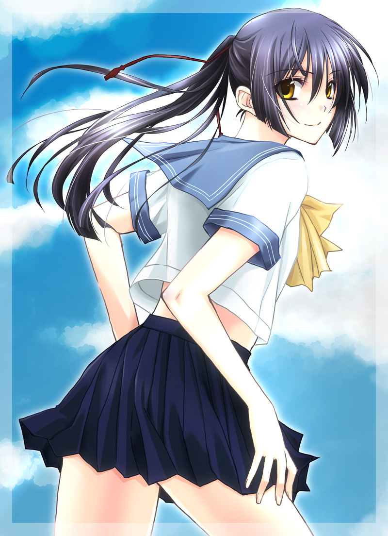 00s1boyblack hairbowcrossdressingcrossdressing (mtf)from behindlong hairlooking backmale focusponytailschool uniformserafukuskirtsmilesolotrapyellow eyes