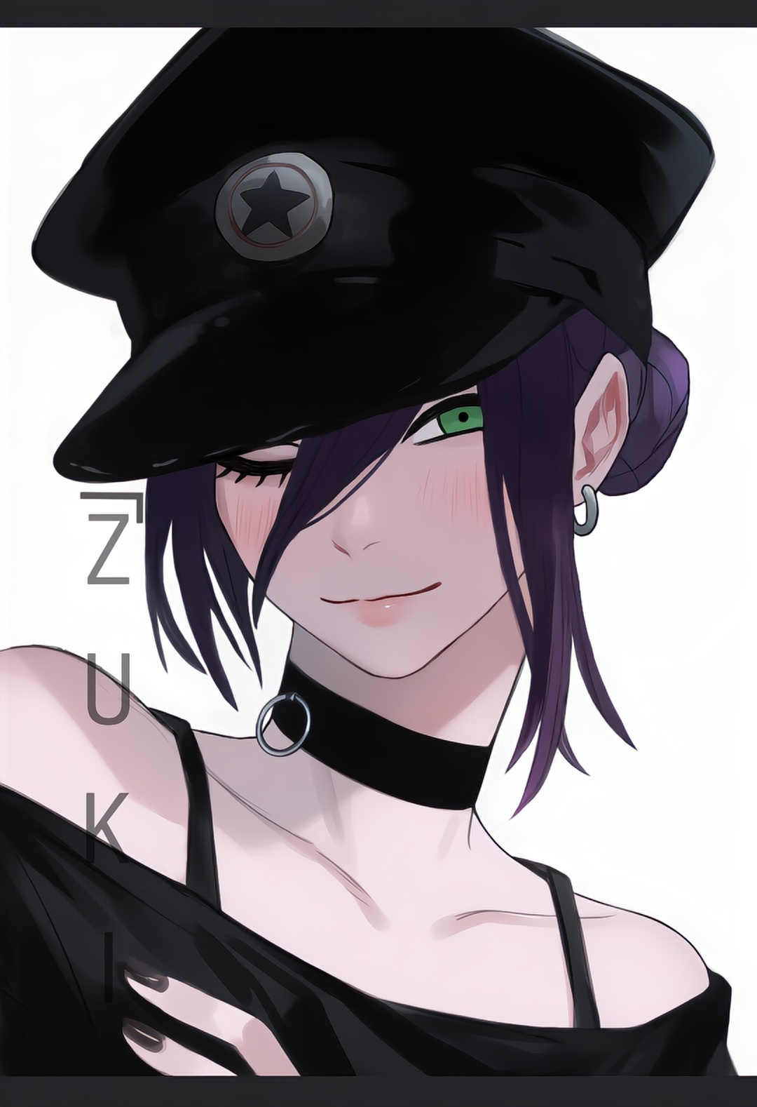 1girlartist nameblack chokerblack hatblack nailschokerearringsgreen eyesgrenade pinhair between eyeshair bunhatjewelrylooking at viewerone eye closedpeaked cappurple hairsimple backgroundsolowhite backgroundzuki (jazs4353)