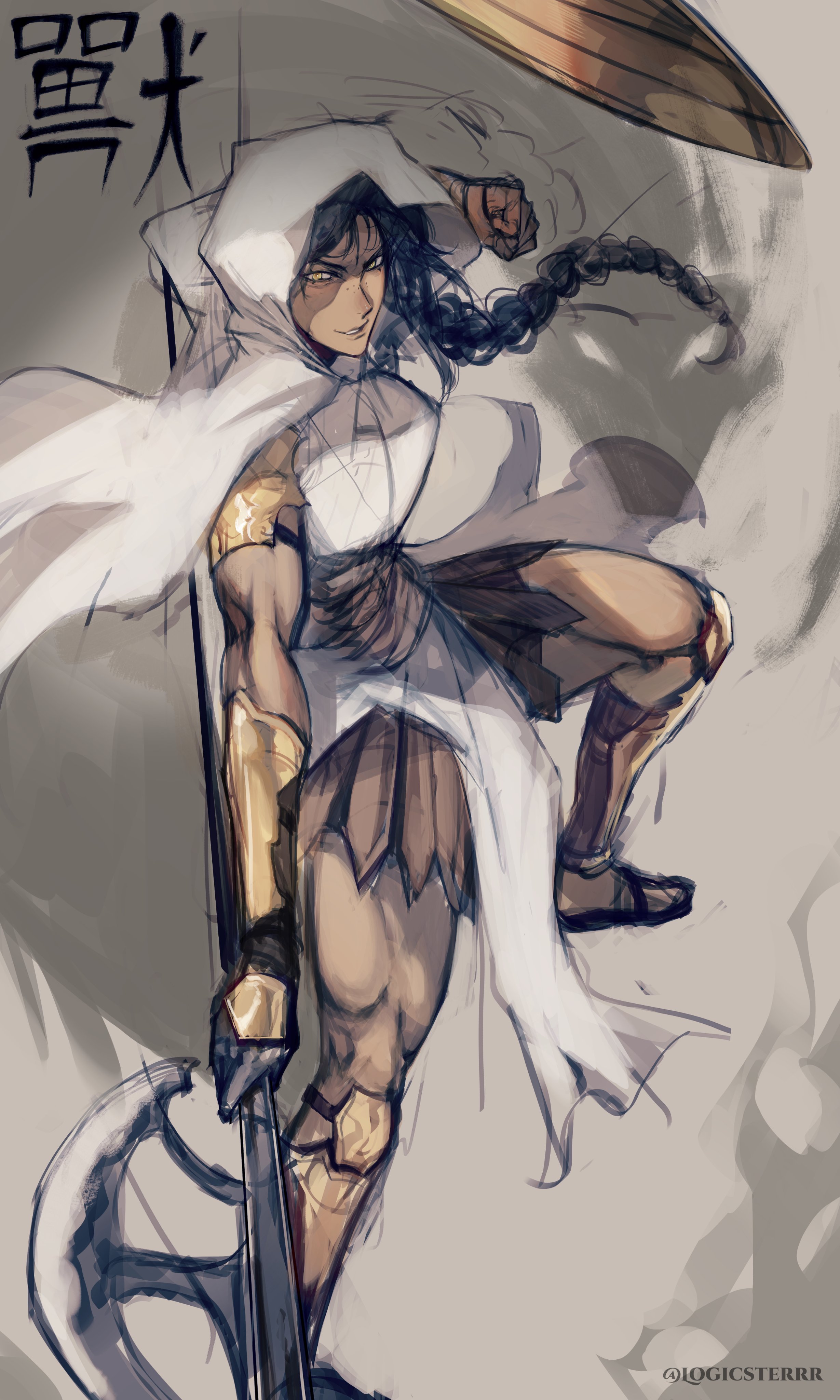 ginko (mushishi), mushishi, 1boy, hair over one eye, male focus, short hair, sitting, solo, table, white hair