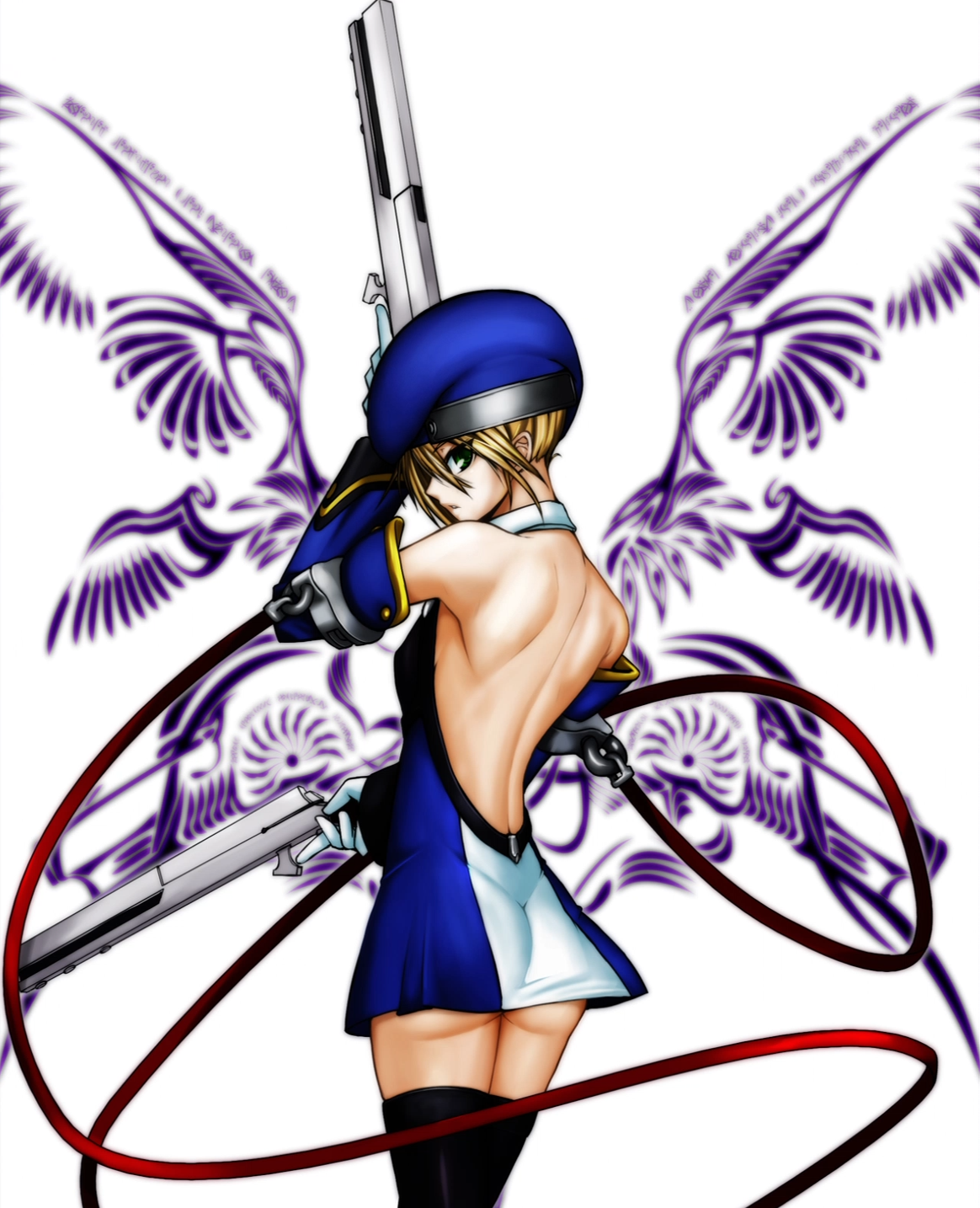 1girlbackberetblonde hairdetached sleevesdressdual wieldingfemale focusfrom behindglovesgreen eyesgunhandgunhands on own hipshatholdingshort dressshort hairsolothighhighsweaponwhite backgroundzettai ryouiki