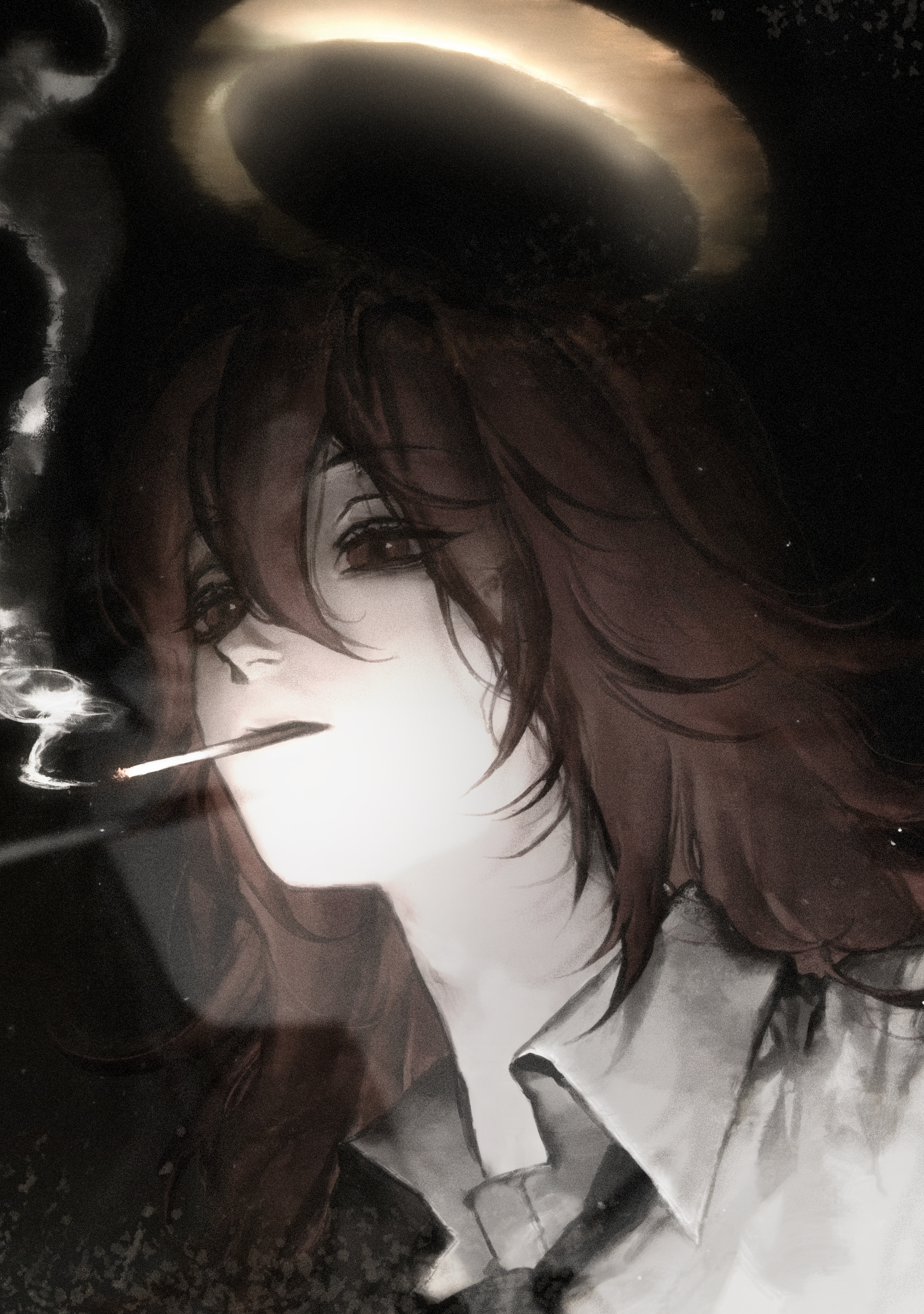 1boyblack necktiecigarettecollared shirtgrey shirthalolong hairmale focusnecktiered eyesred hairshirtsmokesmokingsolo