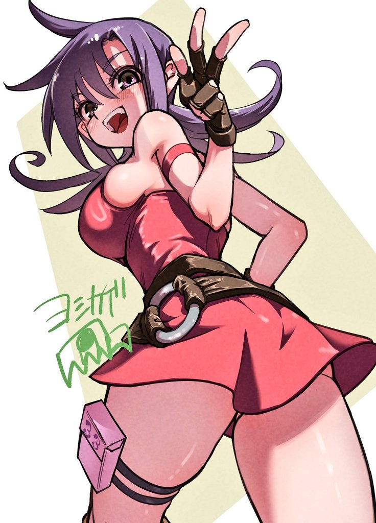 1girlbare shouldersblack glovesbreastscowboy shotdressfingerless glovesfrom behindgloveslarge breastslong hairopen mouthpurple eyesred dresssideboobsimple backgroundsmilesolo