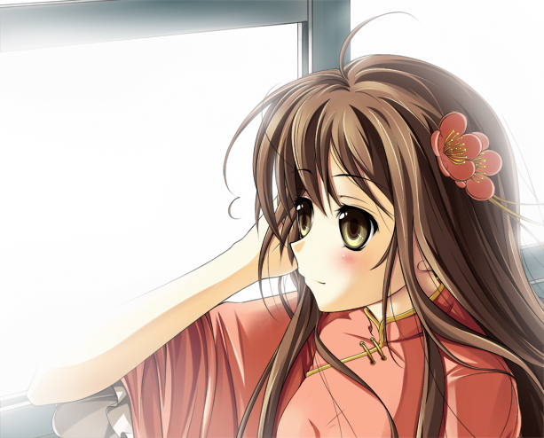 00s1girlahogebrown eyesbrown hairchangpaochina dresschinese clothesdressfemale focusflowerhair flowerhair ornamentlong hairplum blossomssolotaiwanwindow