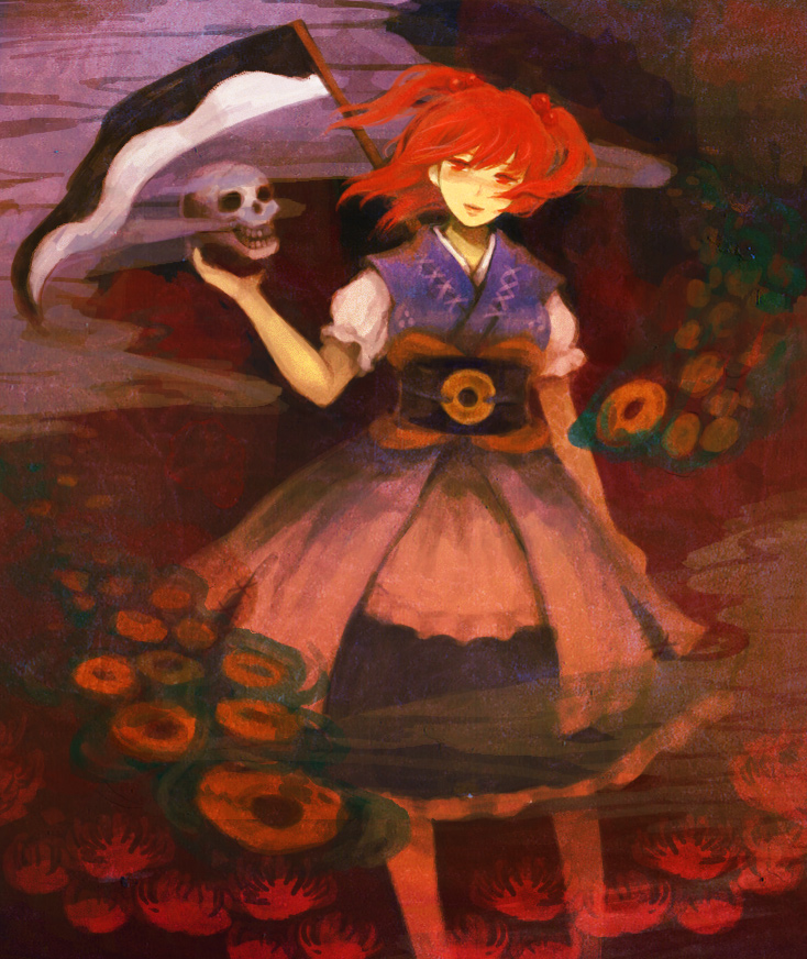1girlfemale focusflowerfoghair bobbleshair ornamentjapanese clothesplantred eyesred flowerred hairscytheskullsolospider lilystanding