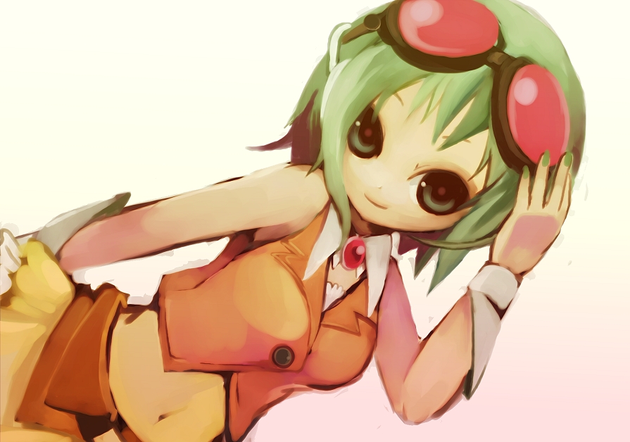 1girlbeltfemale focusgogglesgreen eyesgreen hairheadphonesmatching hair/eyesmidriffshort hairskirtsmilesolowrist cuffs